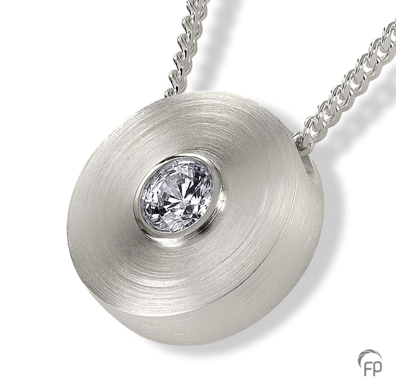 Het assieraad Hanger Schijf met Zirkonia is met de hand gemaakt en is zeer gedetailleerd. Kenmerkend voor dit sieraad is dan ook de perfecte afwerking, waardoor deze niet direct herkenbaar is als ashouder. Dit sieraad is vervaardigd uit hoogwaardig Sterling zilver. Wij vullen het sieraad voor u met het door u meegebrachte as en zorgen voor een perfecte afsluiting. Zo heeft u een tastbare herinnering aan uw dierbare, die u altijd bij u kunt dragen, want de hanger is geschikt voor dagelijks gebruik. De afmeting is 1,9 cm hoog en is, op bestelling, ook verkrijgbaar in geel- en witgoud. Bij deze sieraden worden de Zirkonia steentjes tevens vervangen voor echte diamanten. EUR 260,00 (inclusief vullen en exclusief collier)