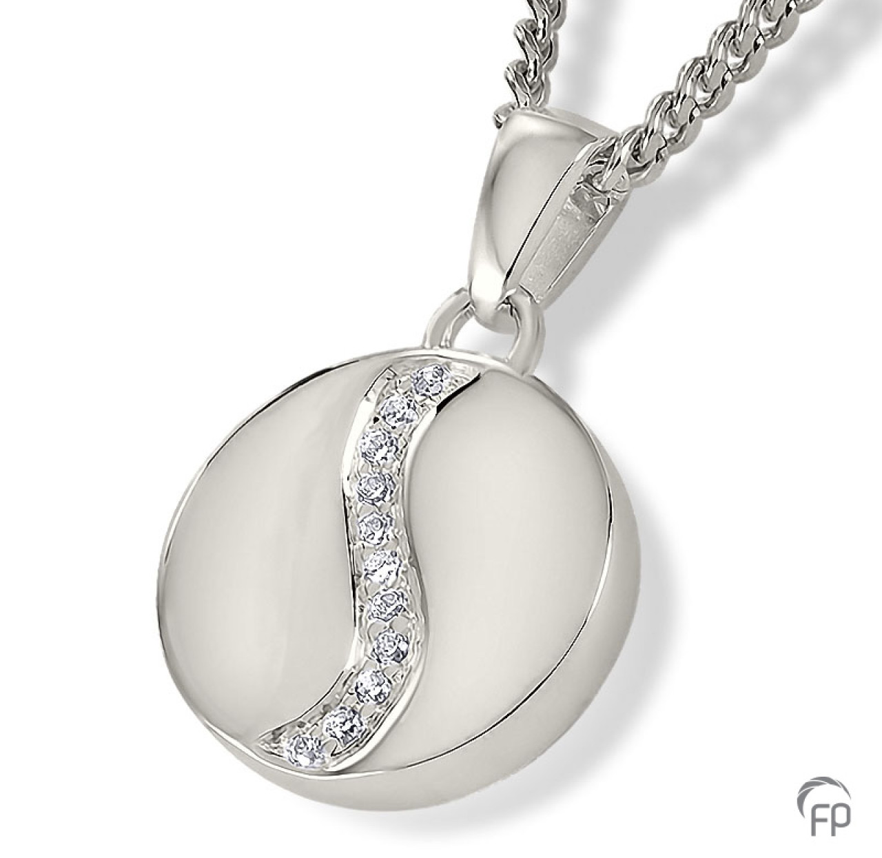 Het assieraad Hanger Schijfje met Zirkonia is met de hand gemaakt en is zeer gedetailleerd. Kenmerkend voor dit sieraad is dan ook de perfecte afwerking, waardoor deze niet direct herkenbaar is als ashouder. Dit sieraad is vervaardigd uit hoogwaardig Sterling zilver. Wij vullen het sieraad voor u met het door u meegebrachte as en zorgen voor een perfecte afsluiting. Zo heeft u een tastbare herinnering aan uw dierbare, die u altijd bij u kunt dragen, want de hanger is geschikt voor dagelijks gebruik. De afmeting is 1,9 cm hoog en is, op bestelling, ook verkrijgbaar in geel- en witgoud. Bij deze sieraden worden de Zirkonia steentjes tevens vervangen voor echte diamanten. EUR 245,00 (exclusief collier)