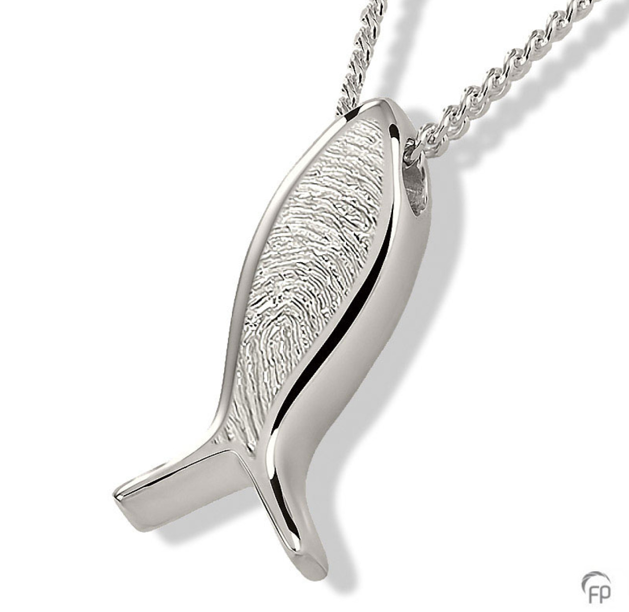 Het assieraad Hanger Vis is met de hand gemaakt en is zeer gedetailleerd. Kenmerkend voor dit sieraad is dan ook de perfecte afwerking, waardoor deze niet direct herkenbaar is als ashouder. De hanger zit niet vast aan het collier, maar het collier loopt door het sieraad heen om een lange en veilige gebruiksduur te kunnen garanderen. Dit sieraad is vervaardigd uit hoogwaardig Sterling zilver. Wij vullen het sieraad voor u met het door u meegebrachte as en zorgen voor een perfecte afsluiting. Zo heeft u een tastbare herinnering aan uw dierbare, die u altijd bij u kunt dragen, want de hanger is geschikt voor dagelijks gebruik. De afmeting is 2,7 cm hoog en is, op bestelling, ook verkrijgbaar in geel- en witgoud. EUR 140,00 (inclusief vullen en exclusief collier)
