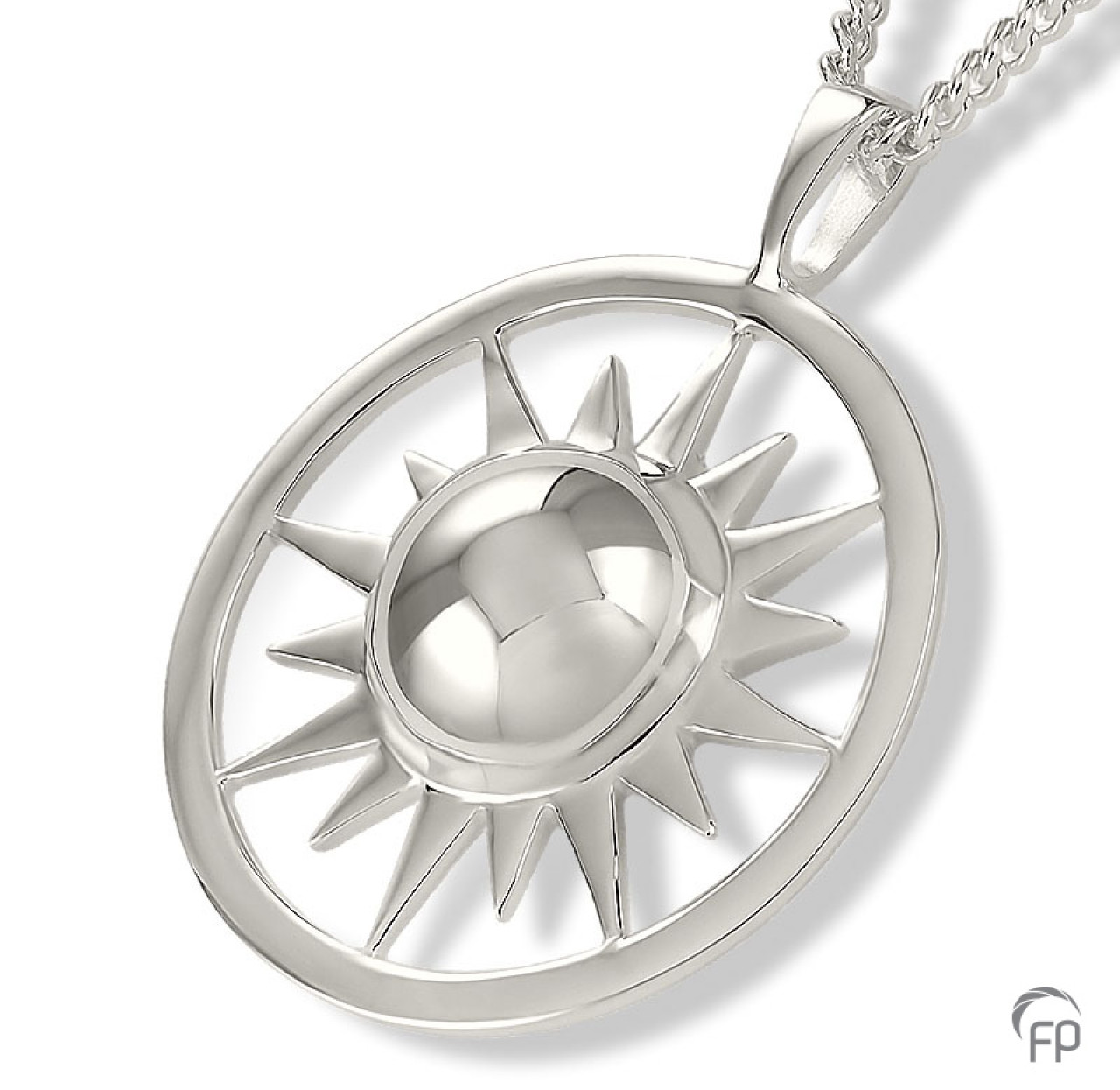 Het Assieraad Hanger Zon ASAH072 is met de hand gemaakt en is zeer gedetailleerd. Kenmerkend voor dit sieraad is dan ook de perfecte afwerking, waardoor deze niet direct herkenbaar is als ashouder. Dit sieraad is vervaardigd uit hoogwaardig Sterling zilver. Wij vullen het sieraad voor u met het door u meegebrachte as en zorgen voor een perfecte afsluiting. Tevens zit de hanger of het bedeltje niet vast aan het collier, maar loopt deze door het sieraad heen om een lange en veilige gebruiksduur te kunnen garanderen. De afmeting is 3,6 cm hoog en is, op bestelling, ook verkrijgbaar in geel- en witgoud. EUR 198,00 (exclusief collier)