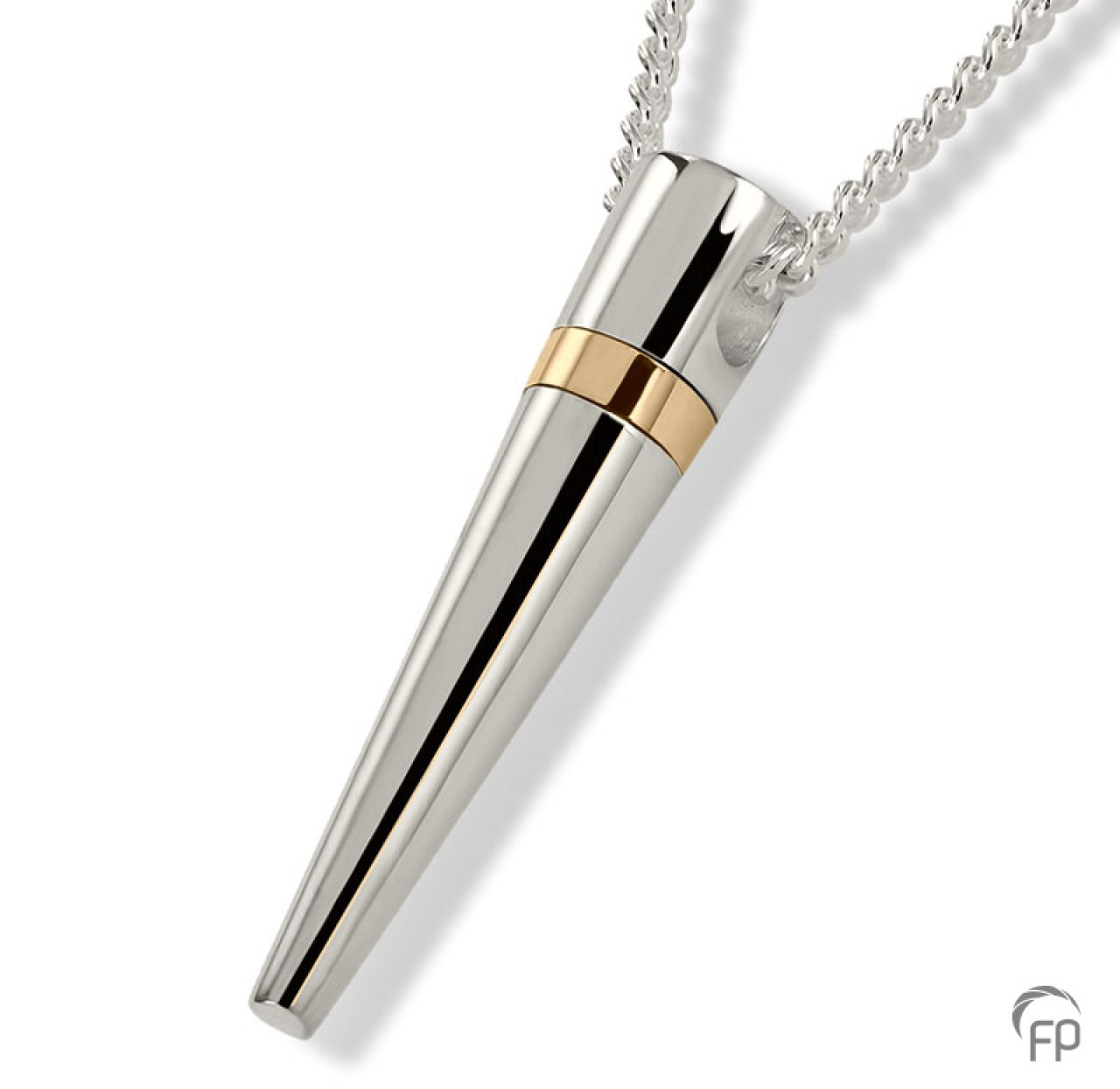 Het assieraad Hanger Tweekleurig Staafje is met de hand gemaakt. Kenmerkend voor dit sieraad is dan ook de perfecte afwerking, waardoor deze niet direct herkenbaar is als ashouder. De hanger zit niet vast aan het collier, maar het collier loopt door het sieraad heen om een lange en veilige gebruiksduur te kunnen garanderen. Dit sieraad is vervaardigd uit hoogwaardig Sterling zilver gecombineerd met goud. Wij vullen het sieraad voor u met het door u meegebrachte as en zorgen voor een perfecte afsluiting. Zo heeft u een tastbare herinnering aan uw dierbare, die u altijd bij u kunt dragen, want de hanger is geschikt voor dagelijks gebruik. De afmeting is 3,4 cm hoog en is, op bestelling, ook verkrijgbaar in geel- en witgoud. EUR 280,00 (inclusief vullen en exclusief collier)