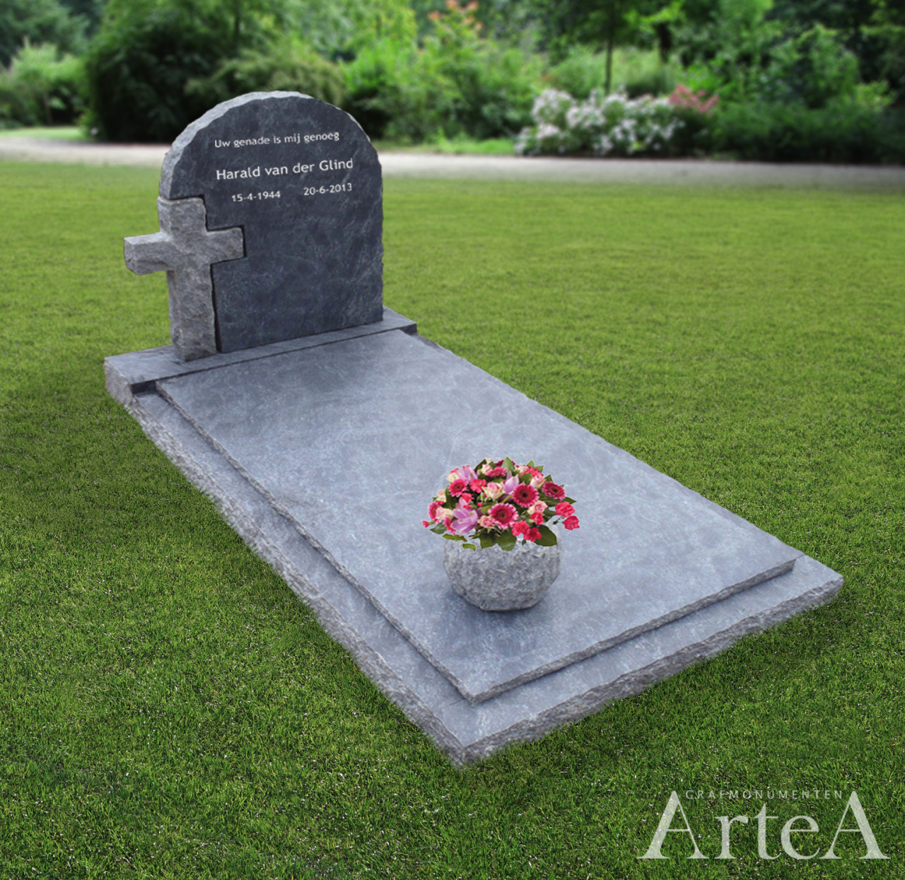 Een bijzondere grafsteen met kruis in ruw en gezoet graniet. Hier uitgevoerd in Orion en met een gesloten dekplaat. Wilt u liever een plantentuin of het liggende deel in een andere uitvoering? De medewerkers van Artea denken met u mee. Prijs vanaf EUR 2.695 inclusief plaatsing