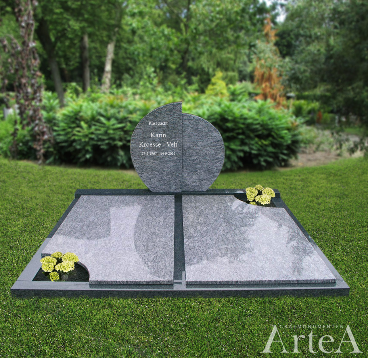 Dubbel grafmonument met twee halve rondingen. Op twee hoeken zijn is een kwart ronding gemaakt voor plantjes. Prijs vanaf EUR 4.895 inclusief plaatsing.