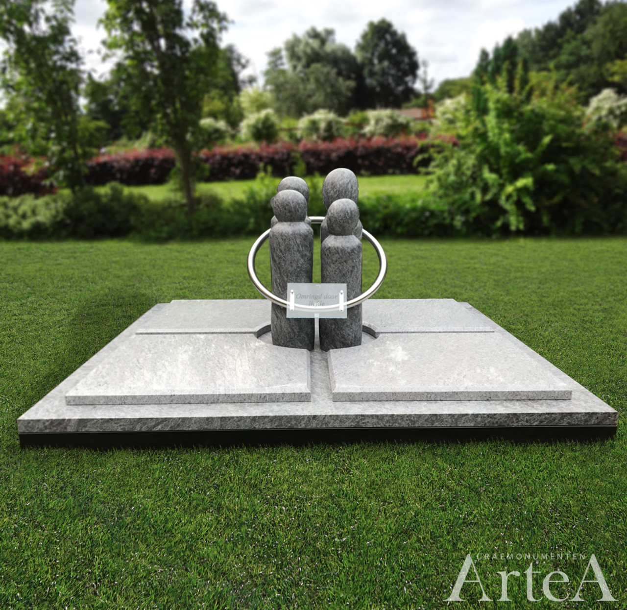 Prachtig dubbel grafmonument met de symboliek "omringd door liefde" Hier is gebruik gemaakt van een rvs ring die het gezin omarmt. Prijs op aanvraag