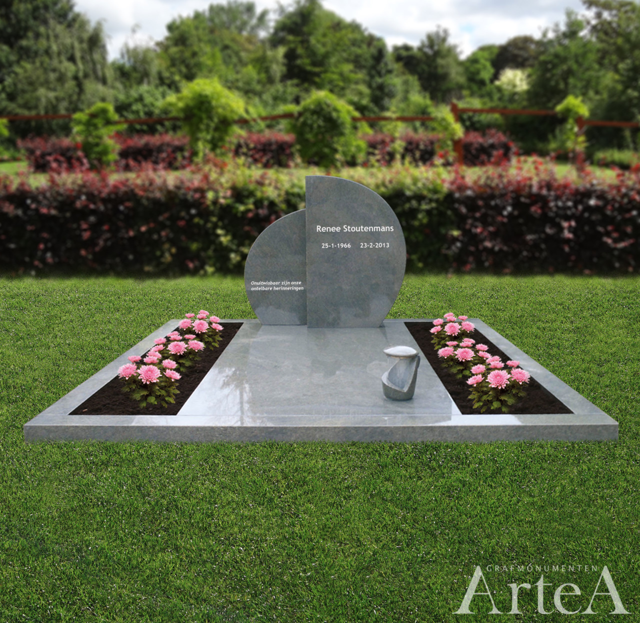 Mooie dubbele grafsteen met ronde staande delen. Uitgevoerd in de granietsoort Emerald Green. Aan beide zijden is er ruimte voor beplanting. Prijs vanaf EUR 4.790 inclusief plaatsing, exclusief accessoires.