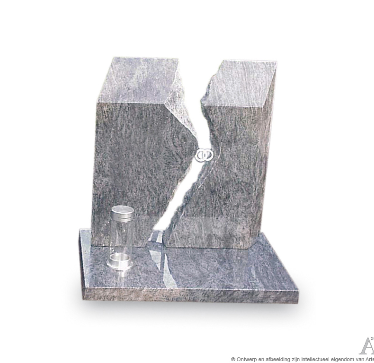 Een symbolisch urnmonument met trouwringen. De trouwringen verbinden de twee helften van het staande deel. Hier is een lichte granietsoort gebruikt. De ringen zijn van RVS. Prijs vanaf EUR 1.095,00 inclusief plaatsing, exclusief accessoires.