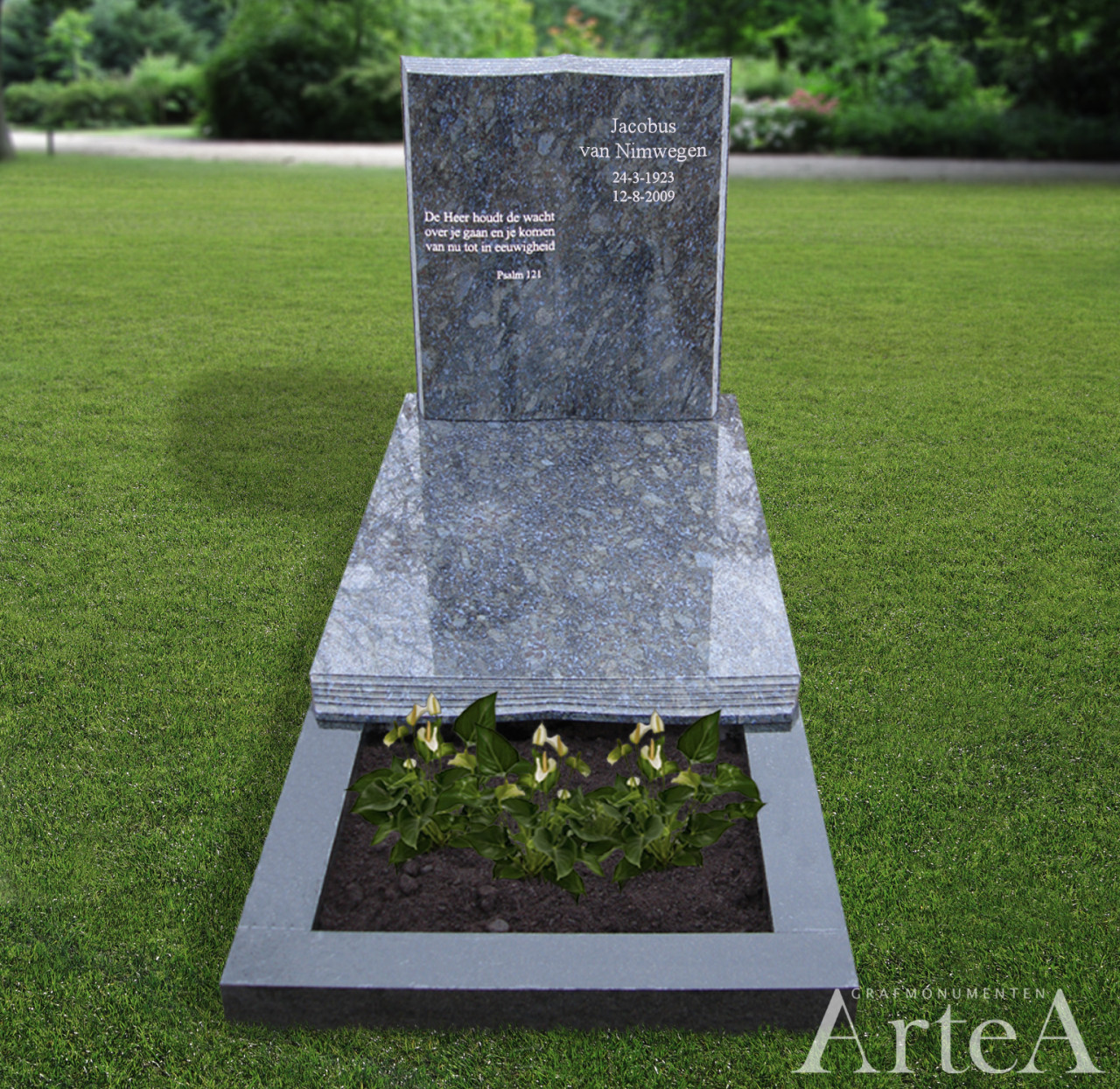 Mooi grafmonument door de eenvoudige vorm; in het staande en liggende deel zijn elementen van een 'boek' verwerkt. Prijs vanaf EUR 3.265 inclusief plaatsing.