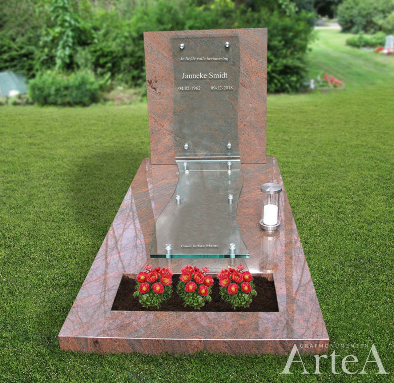 Eigentijds grafmonument met twee glasplaten, hier uitgevoerd in Multicolor Red. De glasplaten zijn bevestigd door middel van rvs afstandhouders. Artea heeft, behalve lantaarns, ook andere accessoires van rvs. Breng gerust een bezoek aan een van onze showtuinen of maak een afspraak met een van onze medewerkers. Prijs vanaf EUR 3.895,00 inclusief plaatsing, exclusief accessoires