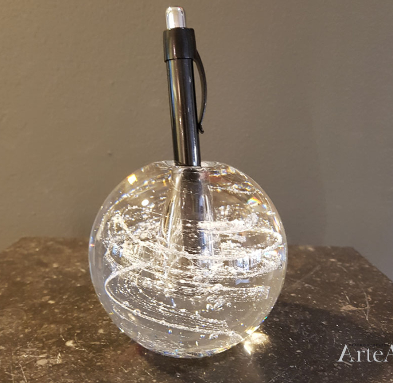 Uniek glasobject met as meegeblazen (zonder kleur) in de vorm van een penhouder (diverse afmetingen pen mogelijk). Een prachtig aandenken dat u zelfs ook functioneel kan toepassen. Diverse kleuren zijn mogelijk. Is echter slechts in één maat uit te voeren: 10x8 cm (het gat in het midden is ongeveer 6 cm diep en 1,5 cm breed). U kunt de as bij ons aanleveren en wij verzorgen dat dit prachtige as-object voor u op maat gemaakt wordt. Prijs EUR 369,00