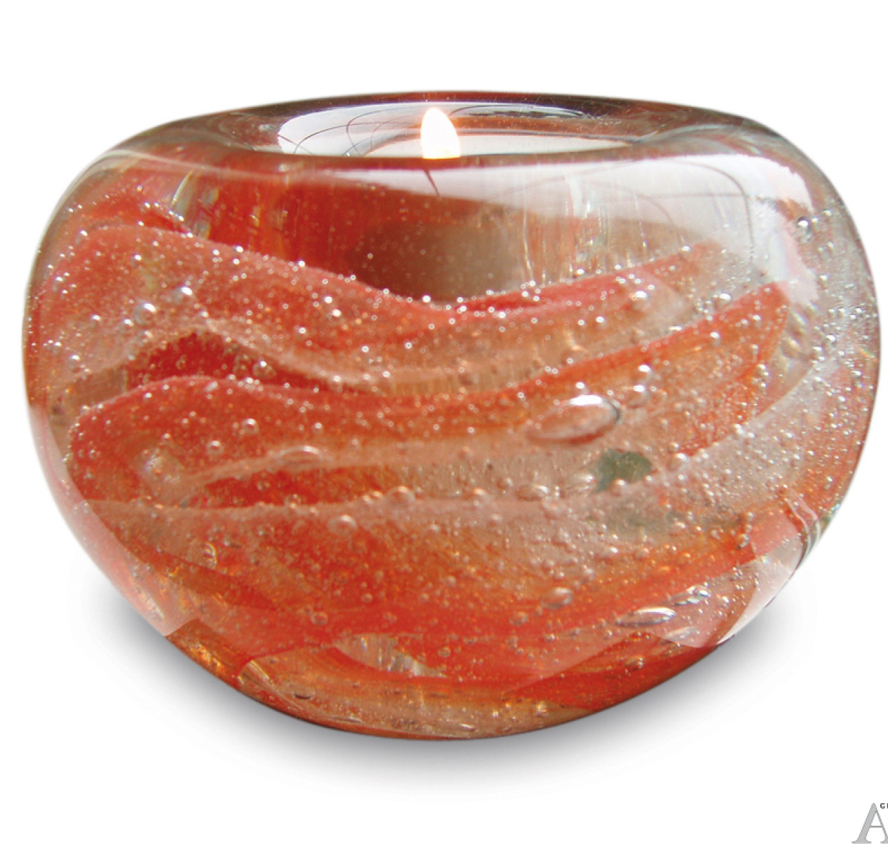 Uniek glasobject waxinelichthouder met as meegeblazen, hier in de kleur rood afgebeeld. Er zijn een 3-tal maten mogelijk: 12x10 cm, 10x8 cm en 8x6 cm. Er zijn diverse kleuren mogelijk; u kunt zelfs een mix van kleuren aanvragen. U kunt de as bij ons aanleveren en wij zorgen ervoor dat dit prachtige as-object voor u op maat gemaakt wordt. Prijs grote maat EUR 318,00 - midden maat EUR 297,00 - kleine maat EUR 283,00