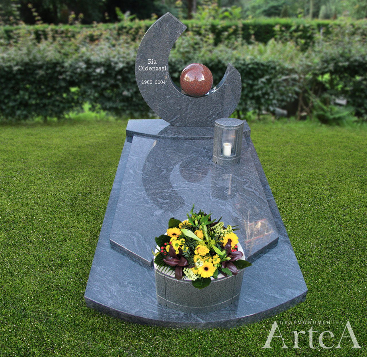 Het accent van dit grafmonument ligt in de abstracte vorm van het kopstuk. Symboliek: 'een parel in God's hand'. Hier is gekozen voor een liggend deel dat geheel gesloten is, maar u kunt ook voor een tuintje of plantenpot kiezen. Prijs vanaf EUR 3.495 exclusief accessoires, maar inclusief plaatsing.