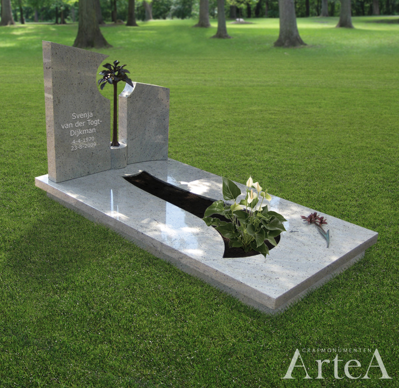 Grafmonument met bronzen boom. Het staande deel van deze grafsteen bestaat uit 2 zuilen met een sokkeltje. Op het sokkeltje is een bronzen boom gezet. U kunt ook kiezen voor een ander bronzen beeld. Prijs vanaf EUR 3.095,00 inclusief plaatsing, exclusief accessoires.