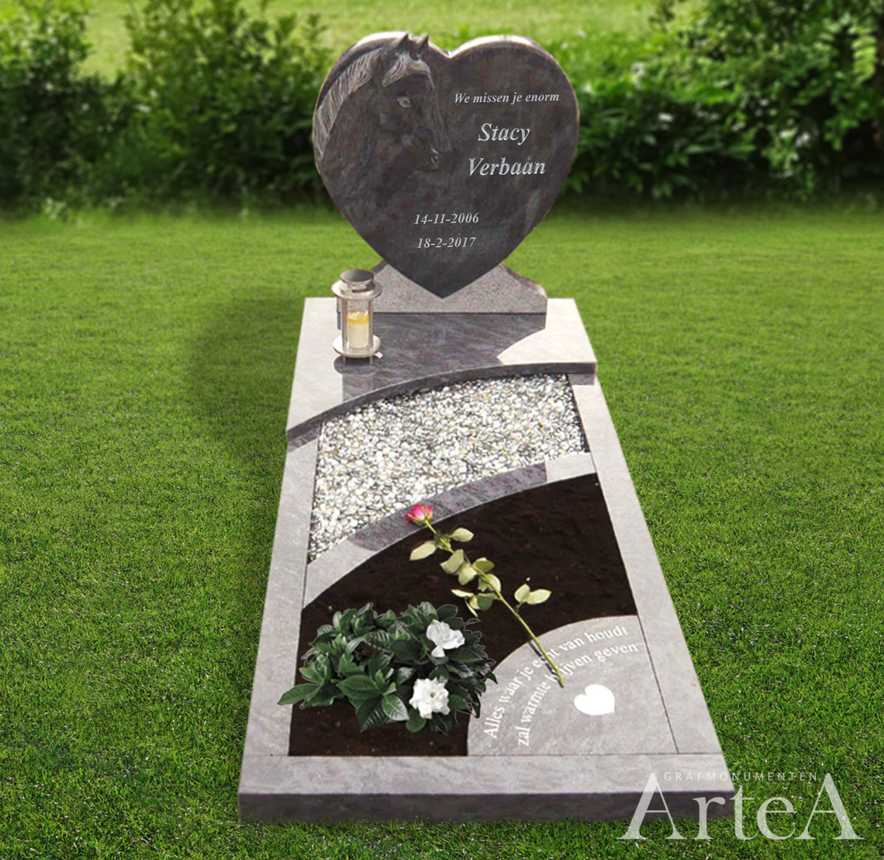Vakkundig gemaakt grafmonument met hart en paardenhoofd in reliëf. Het liggende deel is hier ingevuld met bogen, maar een andere invulling is mogelijk. Heeft u een andere afbeelding in gedachte of wilt u advies? Artea helpt u graag om samen met u tot een mooi ontwerp te komen. Prijs vanaf EUR 3.195,00 inclusief plaatsing, exclusief accessoires