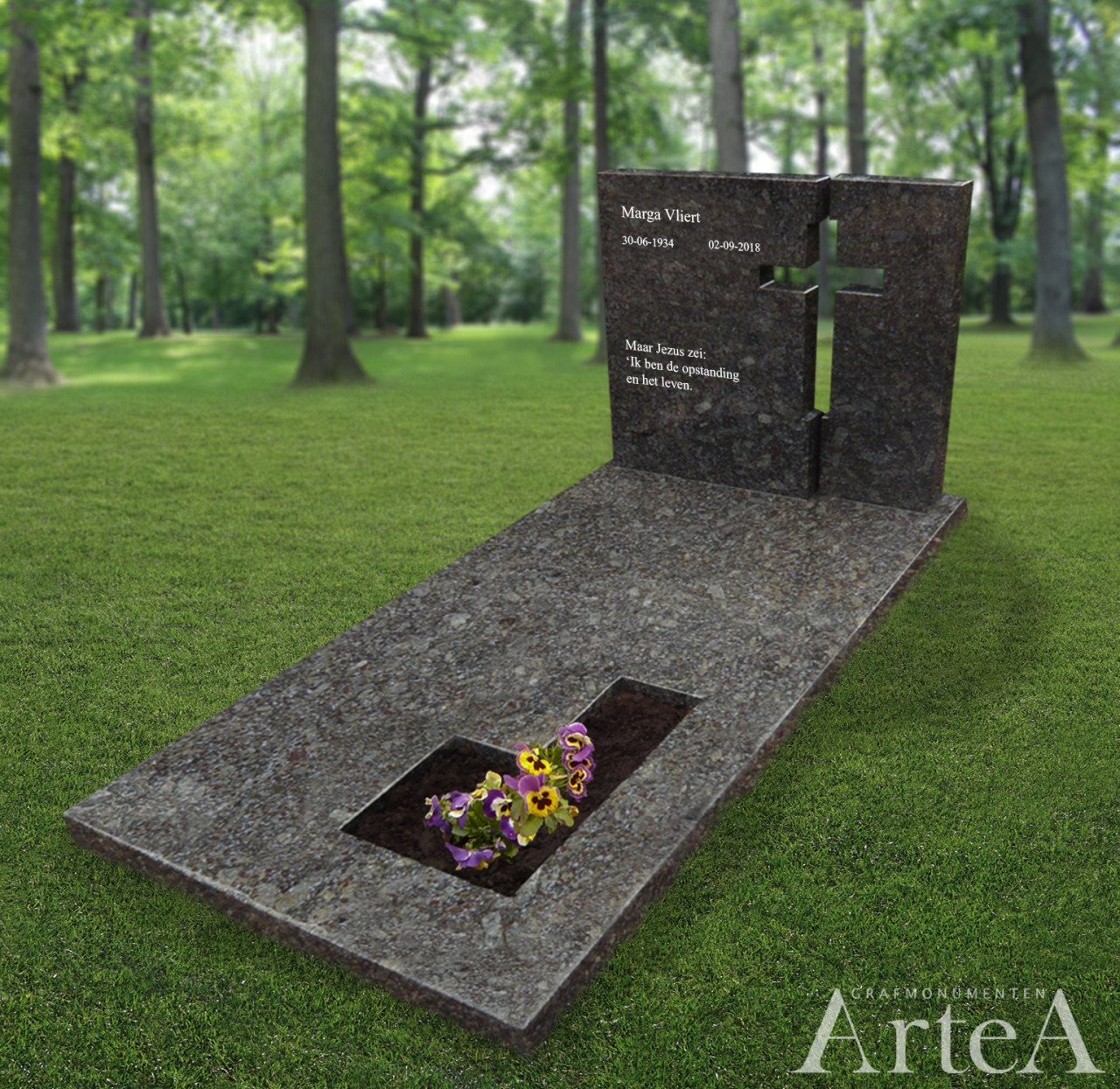 De geschakelde delen met het 'doorkijk kruis' geven dit grafmonument een speciaal karakter. Wenst u de plantenuitsparing in een andere vorm, dan kan Artea daar natuurlijk voor zorgen. Wij hebben een grote collectie grafstenen met kruisen. Kom gerust een langs om u te laten inspireren. Prijs vanaf EUR 3.495 inclusief plaatsing.