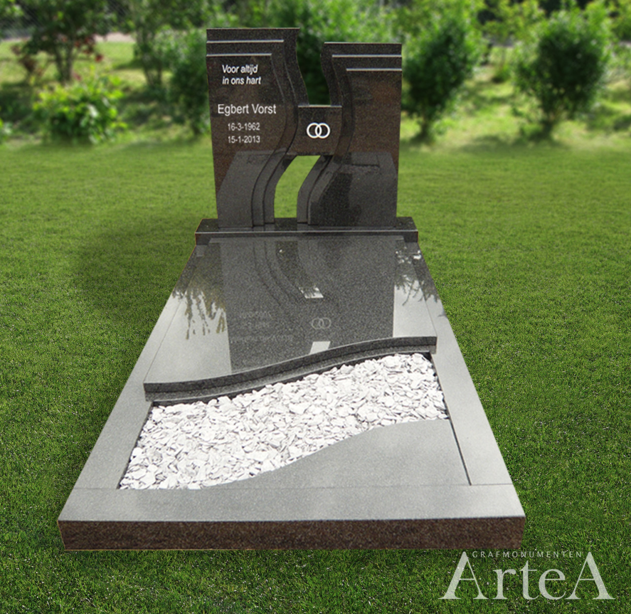 Grafmonument met teruggeslepen delen uitgevoerd in Impala graniet. Het liggende deel heeft een opening voor steentjes. Plant u liever plantjes of bloemetjes dan kan dat natuurlijk ook. Prijs vanaf EUR 2.995 inclusief plaatsing.