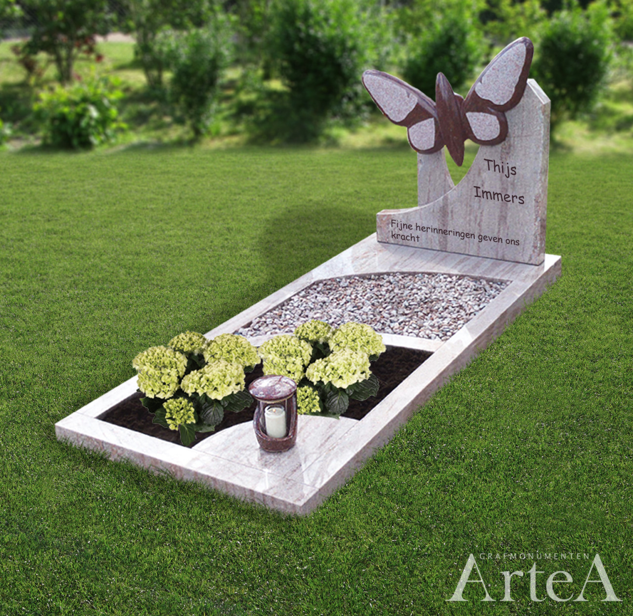 Prachtig grafmonument met een vlinder van graniet. Door de verschillende bewerkingen lijkt het graniet tweekleurig. Het monument heeft in het liggende deel een perkje en een gedeelte voor steentjes. Prijs vanaf EUR 3.095 inclusief plaatsing, exclusief accessoires.