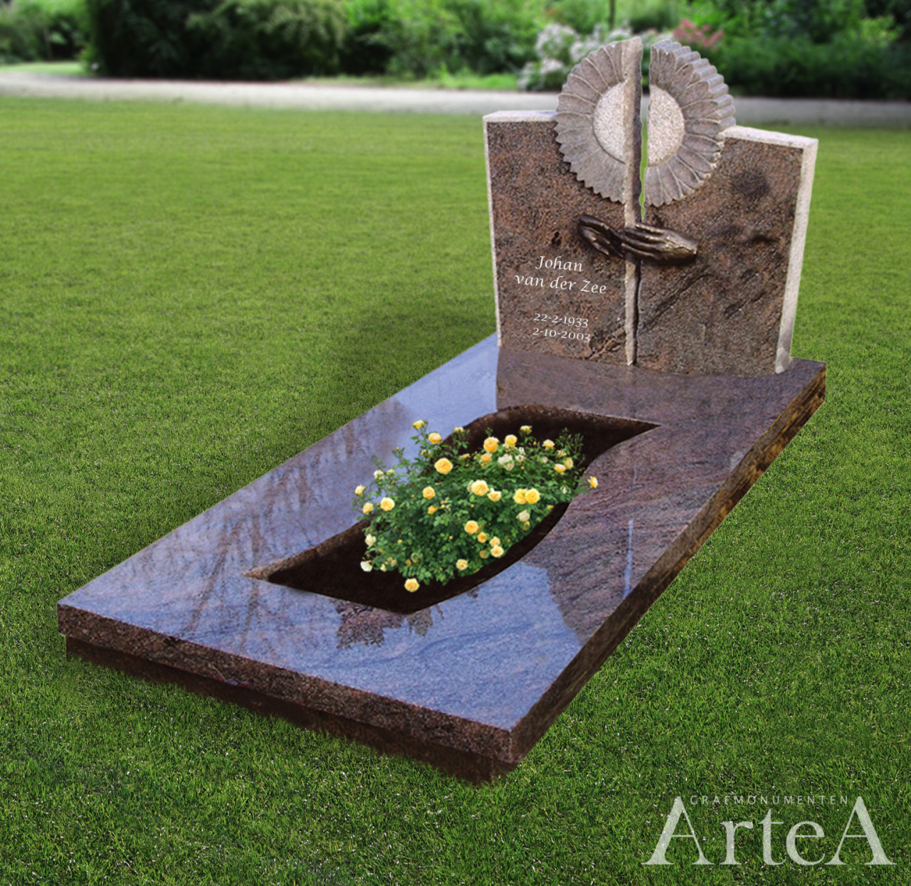 Dit grafmonument met uitgekapte zonnebloem en verbonden bronzen handen. De twee staande delen worden verbonden door de bronzen handen. Mooie symboliek van de verbondenheid. In het liggende deel van het grafmonument is een gedeelte gemaakt zodat er plantjes geplaatst kunnen worden. De plaat kan echte ook geheel gesloten zijn. Leg uw wensen aan ons voor, zodat wij u kunnen helpen deze te realiseren. Prijs vanaf EUR 4.175,00 inclusief plaatsing, exclusief bronzen handen.