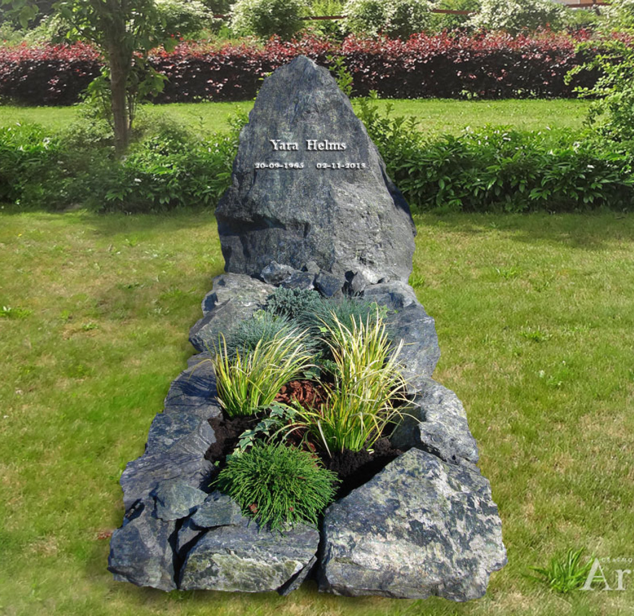 Een natuurlijk vormgegeven grafmonument bestaande uit een ruwe rots en bijpassende brokstukken. U kunt ook ervoor kiezen om bronzen accessoires toe te voegen om het geheel nog persoonlijker te maken. Iedere rots is uniek in vormgeving en kleurenspel. Op de rots zijn alleen metalen letters mogelijk. Prijs vanaf EUR 2.650,00 inclusief plaatsing