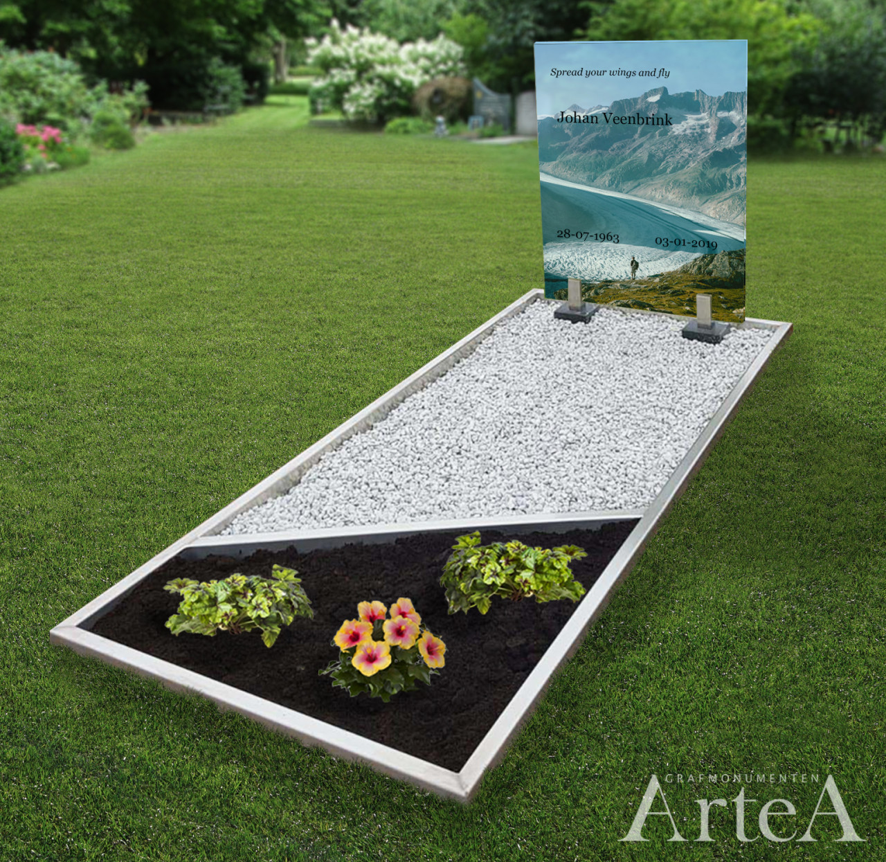 Grafsteen met glasprint en rand van RVS. Op de glasplaat is een eigen foto gebruikt. Op deze manier kan je het grafmonument zeer persoonlijk maken. Heeft u een mooie foto van uw nabestaande en wilt u deze gebruiken op de gedenksteen, laat u dan deskundig adviseren over de vele mogelijkheden. Hier is gekozen voor een rand van RVS. RVS betekend Roest Vast Staal. Het is zeer geschikt om te gebruiken bij een grafmonument. Het geeft een eigentijdse uitstraling. Prijs vanaf EUR 3.395 inclusief plaatsing.