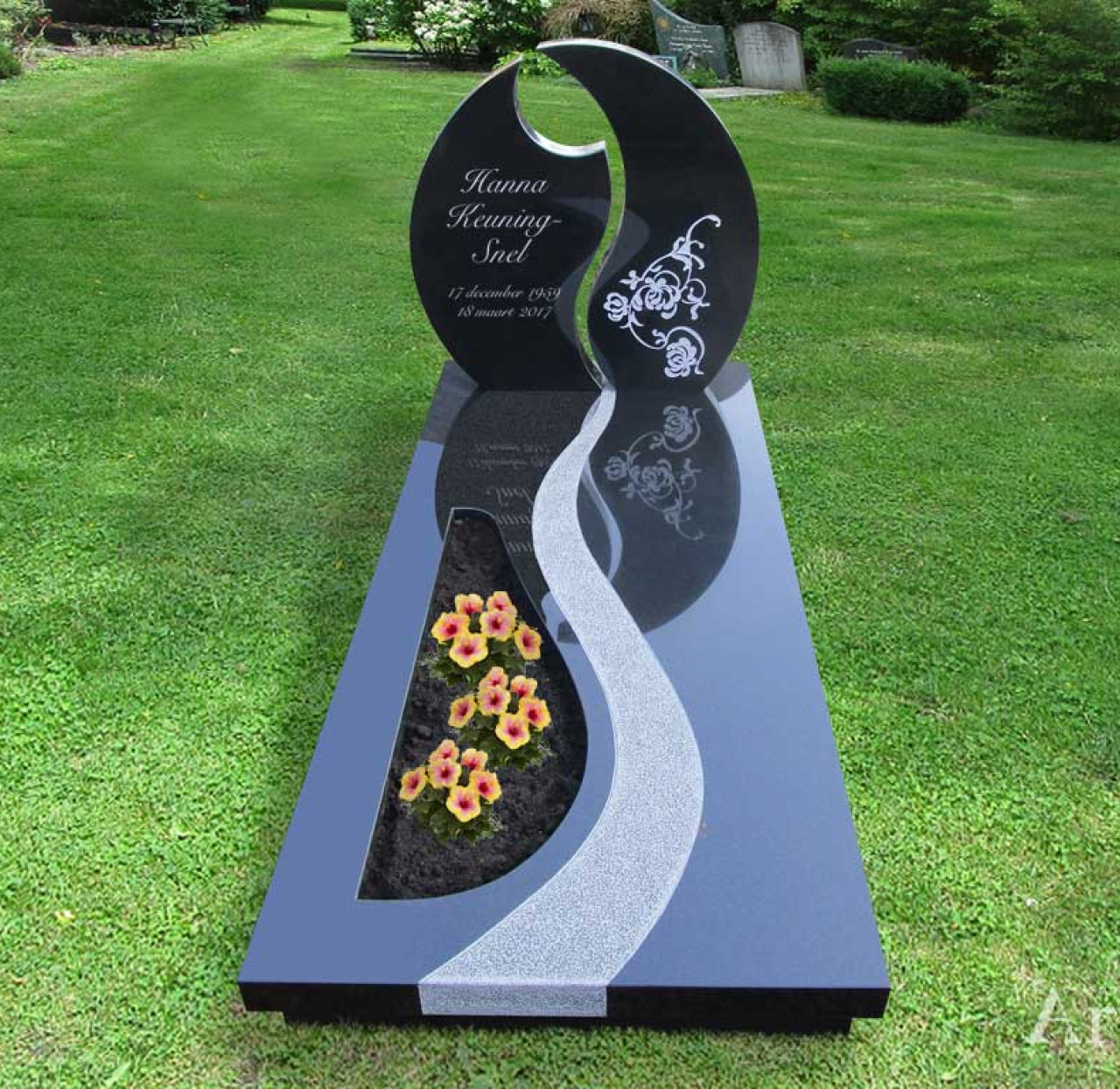 Een bijzondere grafsteen met golvende lijnen. De lijn van het staande deel loopt door tot het liggende deel en vormt daar als het ware, horizontaal een levenspad tot het einde van het graf. Een klein tuintje grenst aan het pad. Uiteraard kunt u er ook voor kiezen om een dichte plaat te gebruiken. Prijs vanaf EUR 3.395 inclusief plaatsing.