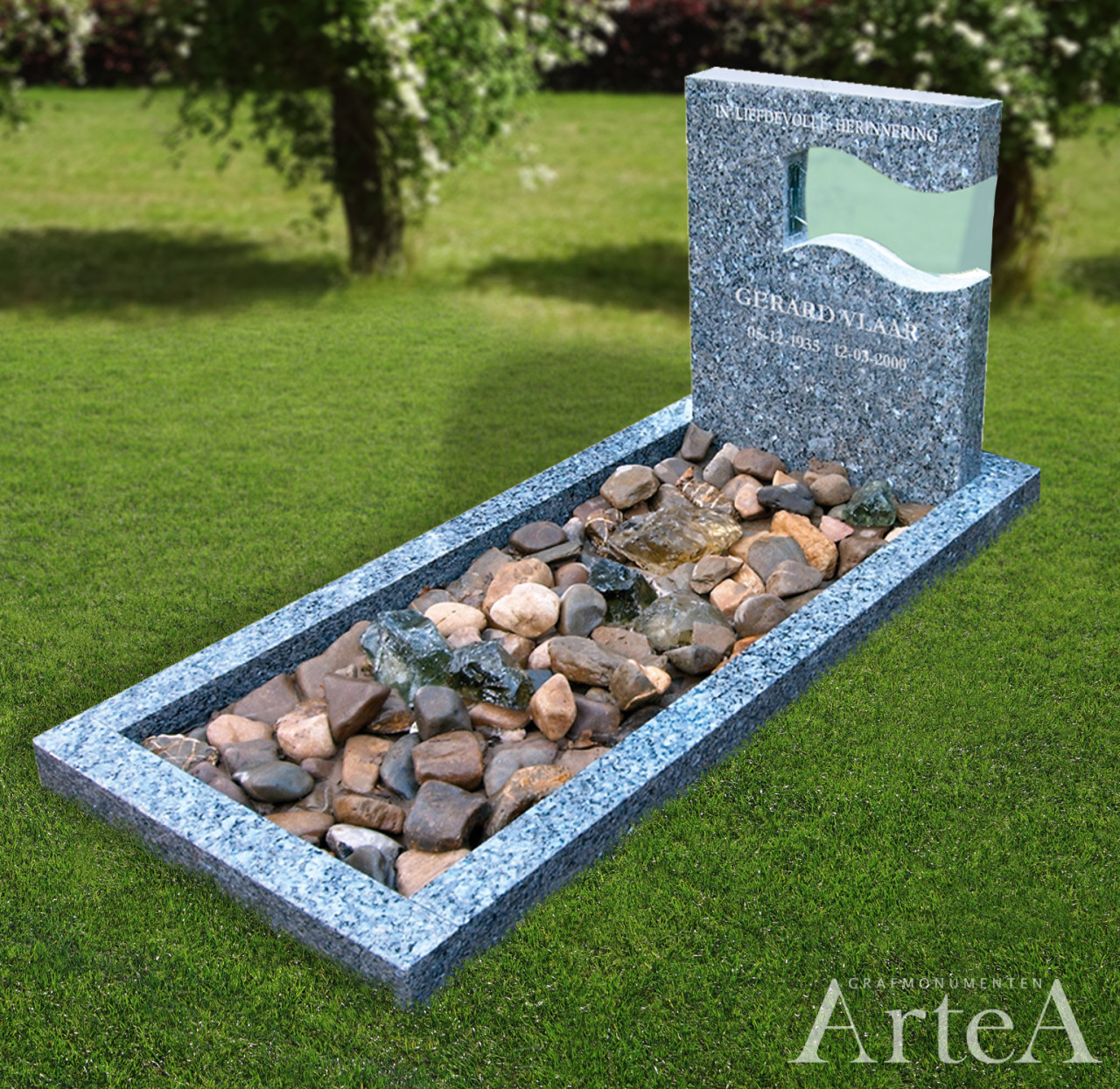 Grafsteen met groen glas in Labrador Blue graniet. In het kopstuk is glas verwerkt. De maaskeien geven een speels effect. Wilt u een andere vorm in het glas? Ook dat is mogelijk. Vraag onze medewerkers gerust om advies. Prijs vanaf EUR 2.795,00 inclusief plaatsing