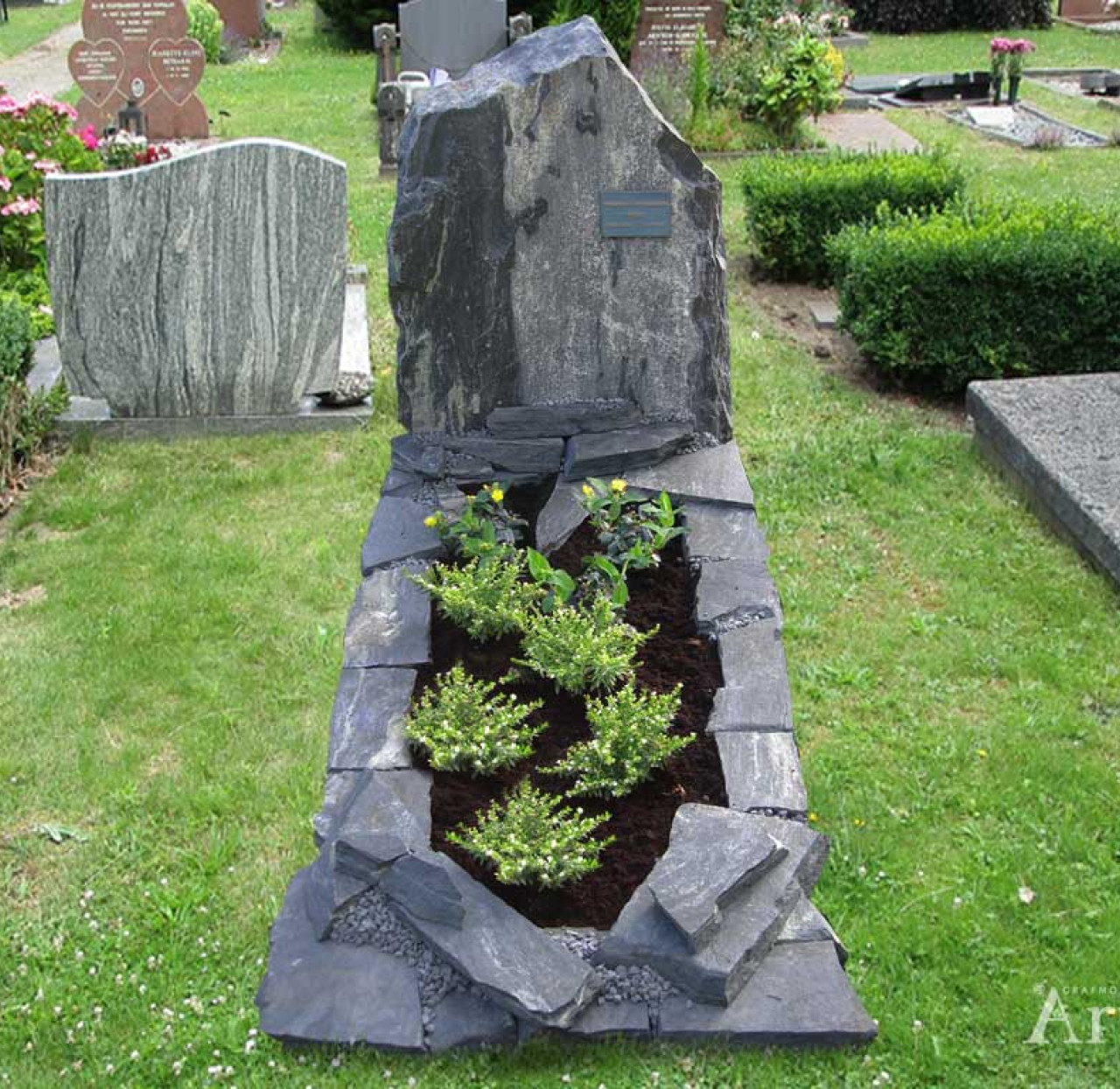 Een mooi natuurlijk monument: een ruwe rots met een flagstoneomranding. Iedere rots is uniek in vormgeving en kleurenspel. Op de rots zijn alleen metalen letters mogelijk. Hier is gekozen voor een bronzen letterplaat. Prijs vanaf EUR 3.350 inclusief plaatsing, exclusief accessoires
