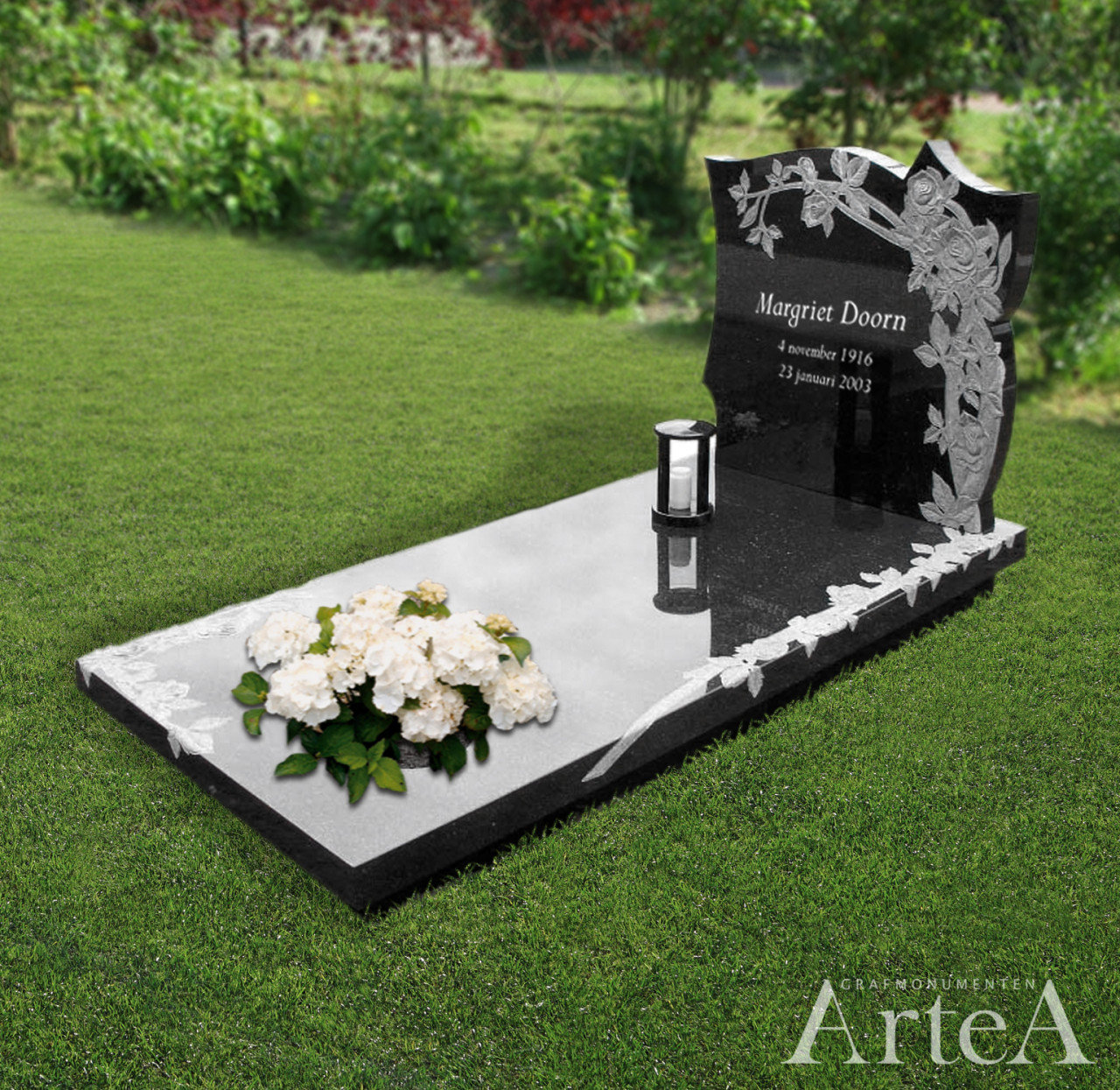 Schitterend grafmonument uitgevoerd in Premium Black. De vakkundig uitgekapte rozentakken maken dit monument tot een waar kunstwerk. Prijs vanaf EUR 4.835,00 inclusief plaatsing.