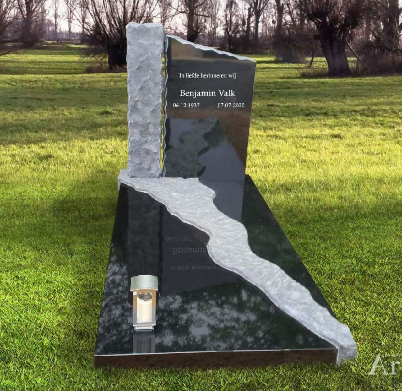 Een grafsteen met ruw en glad graniet. Ruw en glad zijn de contrasten in het leven waar we mee te maken kunnen hebben. Symbolisch is er een weg gekapt op het liggende deel. De weg naar het hiernamaals. Deze grafsteen verteld als het ware een verhaal. Het is uitgevoerd in zwart graniet. Prijs vanaf EUR 3.780 inclusief plaatsing, exclusief accessoires.