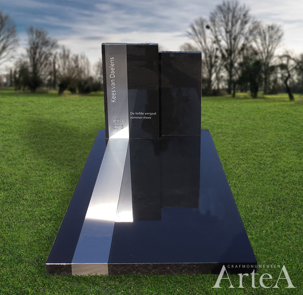 Strak en modern grafmonument hier uitgevoerd in zwart graniet met RVS. Het kopstuk is tweedelig. Prijs vanaf EUR 4.995,00 inclusief plaatsing