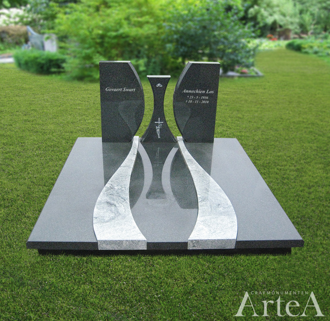 Moderne dubbele grafsteen met levenswegen in de granietsoorten Beida Black en Viscount White. Prachtig monument door de vloeiende lijnen in combinatie met de strakke buitenranden van zowel het staande als het liggende deel. Een voorbeeld van vakmanschap. Prijs vanaf EUR 8.950 inclusief plaatsing, exclusief accessoires.