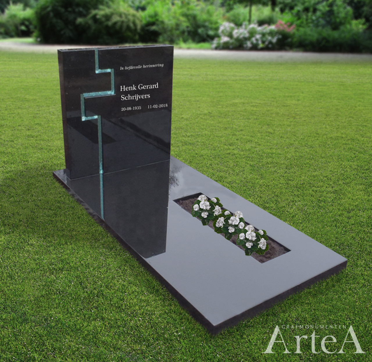 Moderne grafsteen, hier prachtig uitgevoerd in zwart gepolijst graniet met geknabbeld glas in de vorm van een kruis. De strakke, rechthoekige plantentuin is asymmetrisch aangelegd en zorgt voor harmonie. Prijs vanaf EUR 3.955,00 inclusief plaatsing