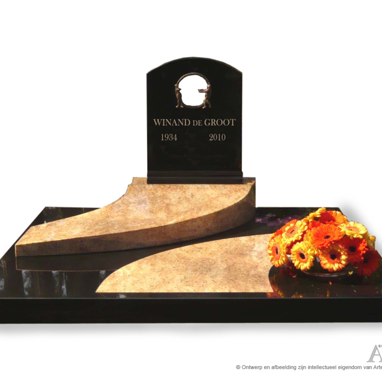 Een prachtig urnmonument, hier uitgevoerd met de symboliek van de levensweg. Door gebruik te maken van twee contrasterende kleuren graniet, zoals u hier ziet, wordt het monument sprekend. Prijs vanaf EUR 1.695,00 inclusief plaatsing, exclusief accessoires.