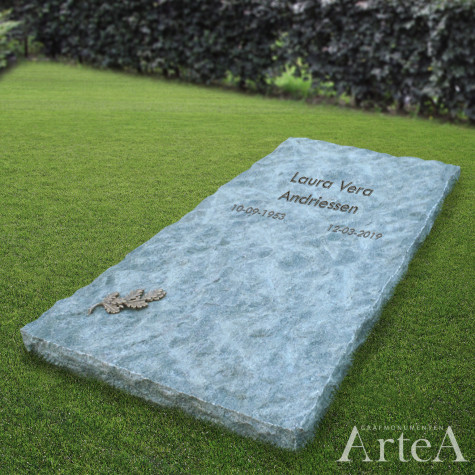 Robuuste ruwe liggende grafsteen. Deze grafsteen heeft een robuuste uitstraling door de gekapte bewerking van het graniet in combinatie met de "ingezaagde blokrand". Hier is gekozen voor een plantentuin. Prijs vanaf EUR 3.795,00 inclusief plaatsing
