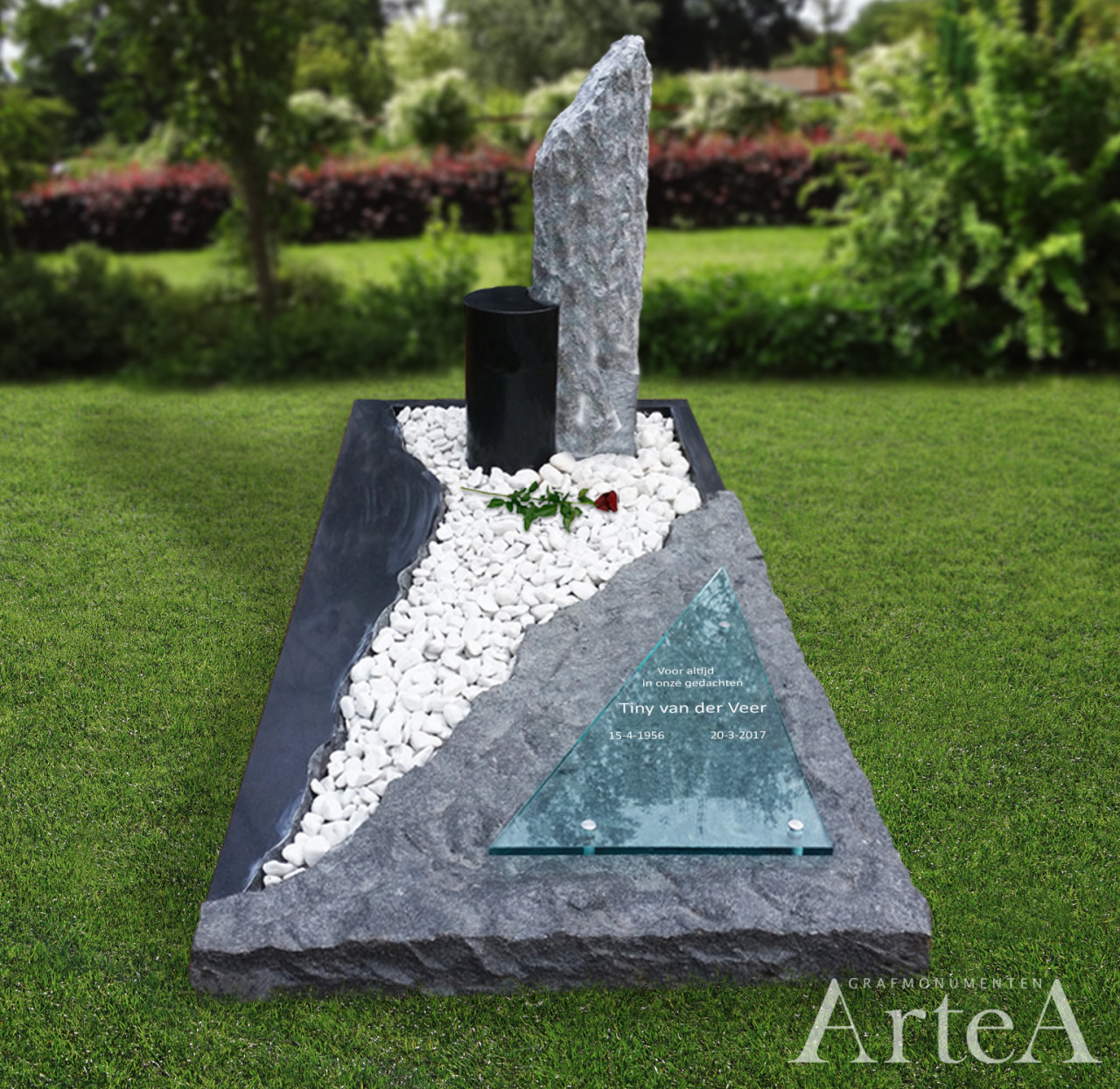 Ruw gekapte grafsteen met glasplaat. Bijzonder mooi monument, op de glasplaat is de tekst uitgestraald. Prijs vanaf EUR 3.695,00 inclusief plaatsing, exclusief accessoires.