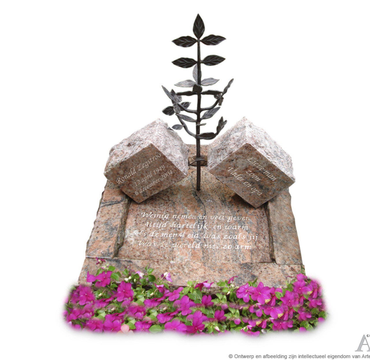 Speels urnmonument, hier uitgevoerd in Tropical Apricot met brons. De boom lijkt uit de twee gekantelde "rotsen" gerezen te zijn. Een mooi symbolisch kunstwerkje. Prijs vanaf EUR 1.025,00 inclusief plaatsing, exclusief accessoires.