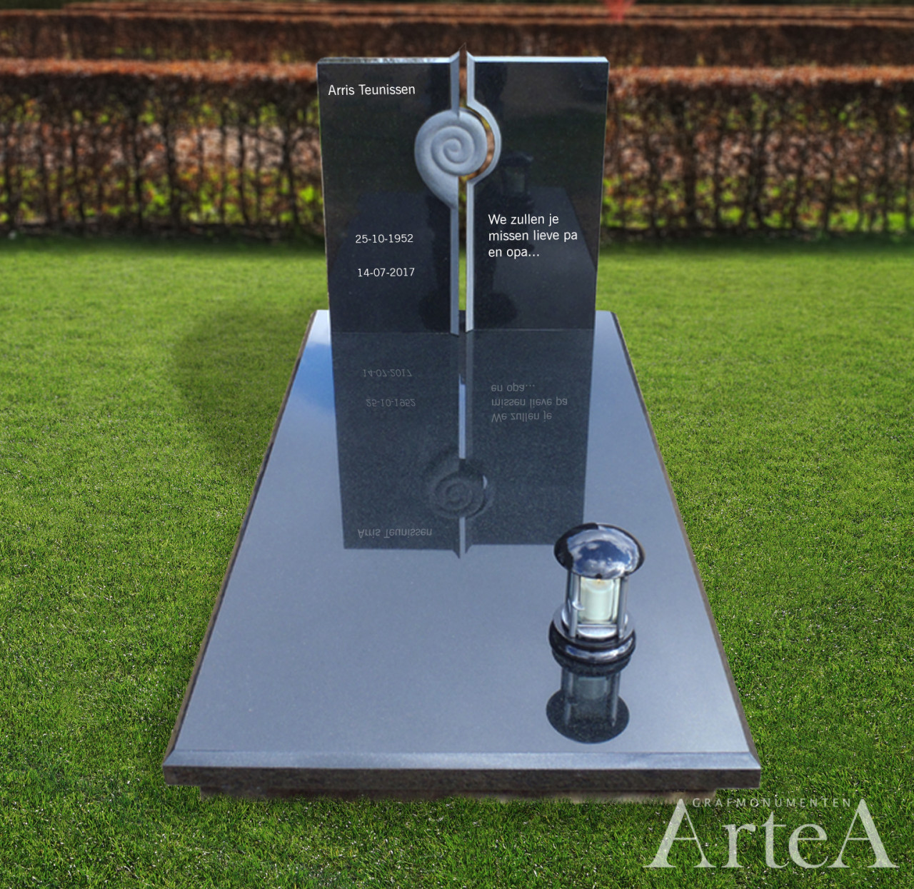 Stijlvolle grafsteen waarbij het kopstuk uit twee delen bestaat, waarvan bij beide delen de tekstvlakken zijn terug geslepen. Het liggende deel is hier een gesloten dekplaat. Uiteraard kunt u ook kiezen voor een tuintje of uitsparing voor steentjes. Prijs vanaf EUR 3.845 exclusief accessoires, inclusief plaatsing.