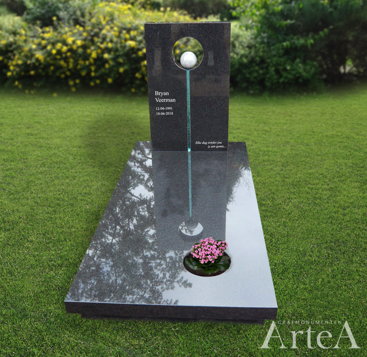 Strak en modern grafmonument met geknabbeld glas en bol van kristal. In de doorkijk is een bol van kristal geplaatst. Dit kan ook een bal van graniet zijn. Wilt u liever een groter plantentuin of een lichter granietsoort? Breng gerust een bezoek aan een van onze showtuinen, daar hebben wij een grote keuze aan grafstenen. Prijs vanaf EUR 2.995,00 inclusief plaatsing, exclusief accessoires.