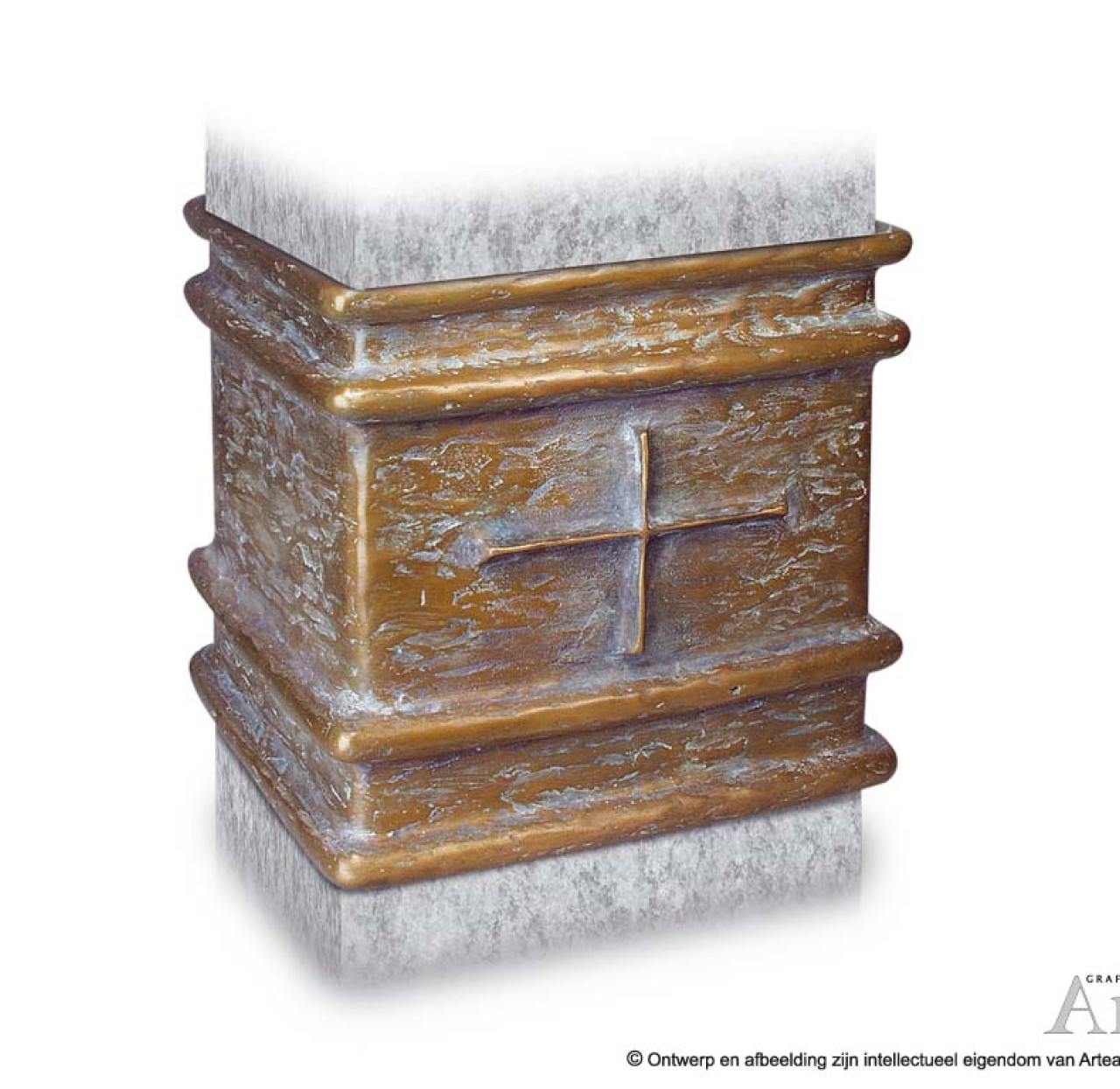 Rustige urn van brons met kruis. Een ontwerp van Strassacker. Deze urn heeft een afmeting van 27 x 28 x 28 cm. Door de vorm is deze urn makkelijk te integreren in een urnmonument. Hier is de urn als voorbeeld tussen twee zuilen van graniet geplaatst.
