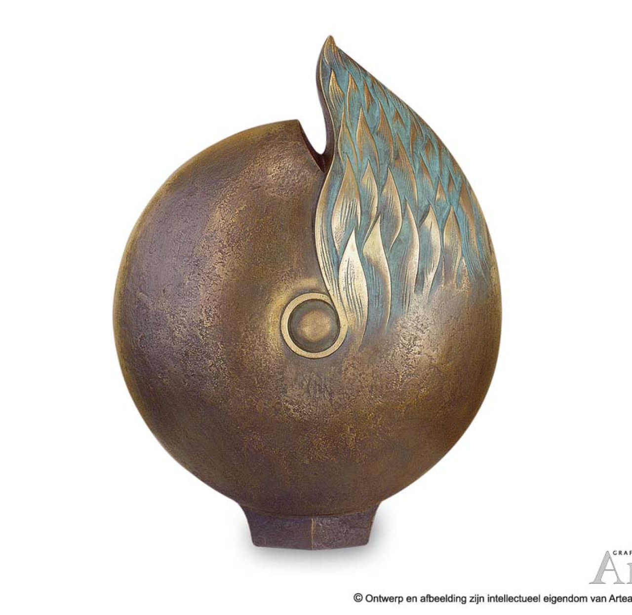 "Metamorfose" is de naam van deze exclusieve bronzen urn, ontworpen door Strassacker. Aan de achterkant is een afbeelding van een blad. De afmeting is 37 x 29 x 12 cm.