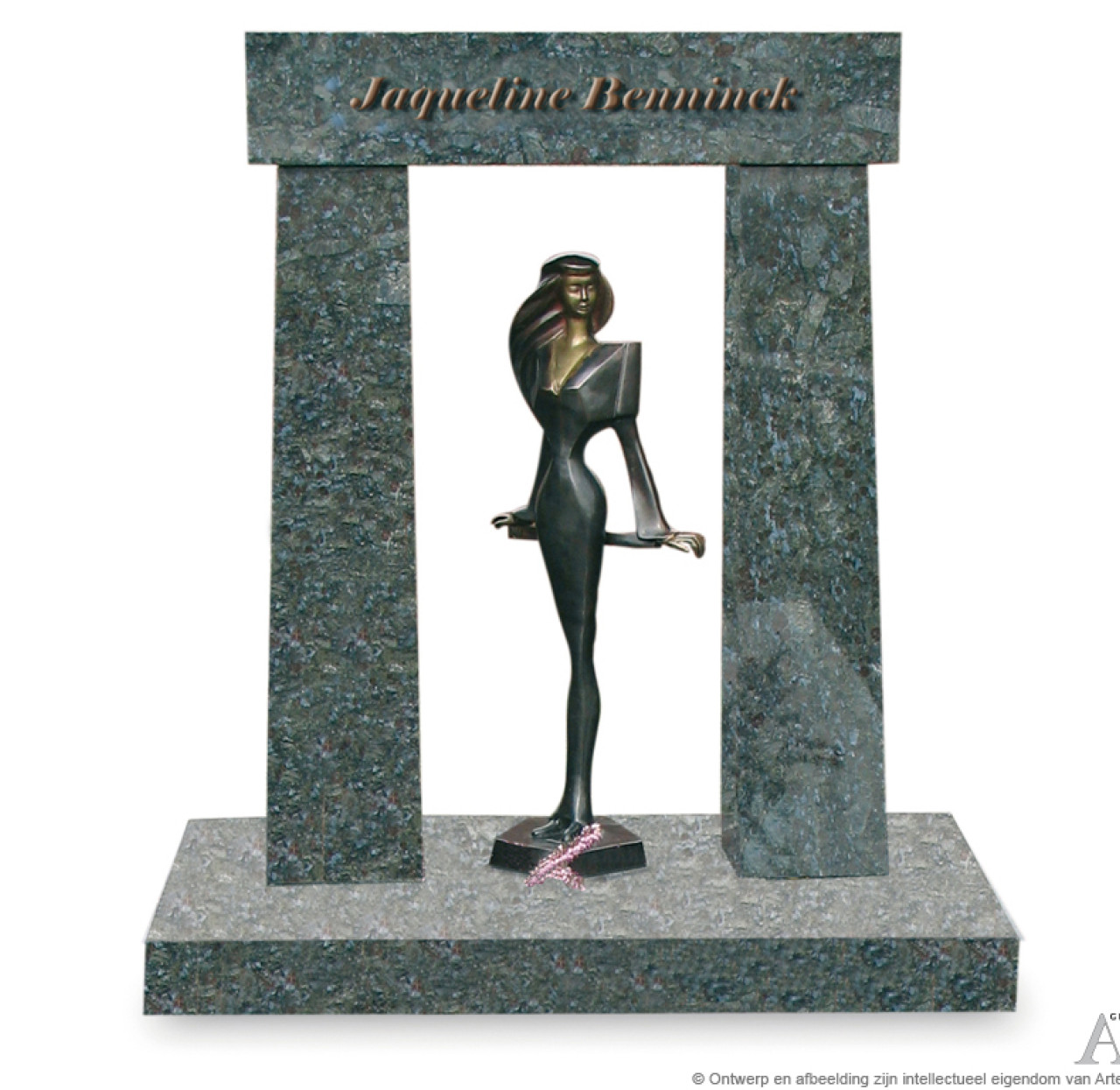 Dit urnmonument in Butterfly Blue met bronsbeeld is als een poort ontworpen. Het bronzen beeld wordt daardoor als het ware omlijst. Wilt u ook iets dergelijks, of heeft u zelf een beeld dat u graag verwerkt in een monument? Kom gerust langs of maak een afspraak met een van onze medewerkers. Wij helpen u graag. Prijs vanaf EUR 595,00 inclusief plaatsing, exclusief accessoires.