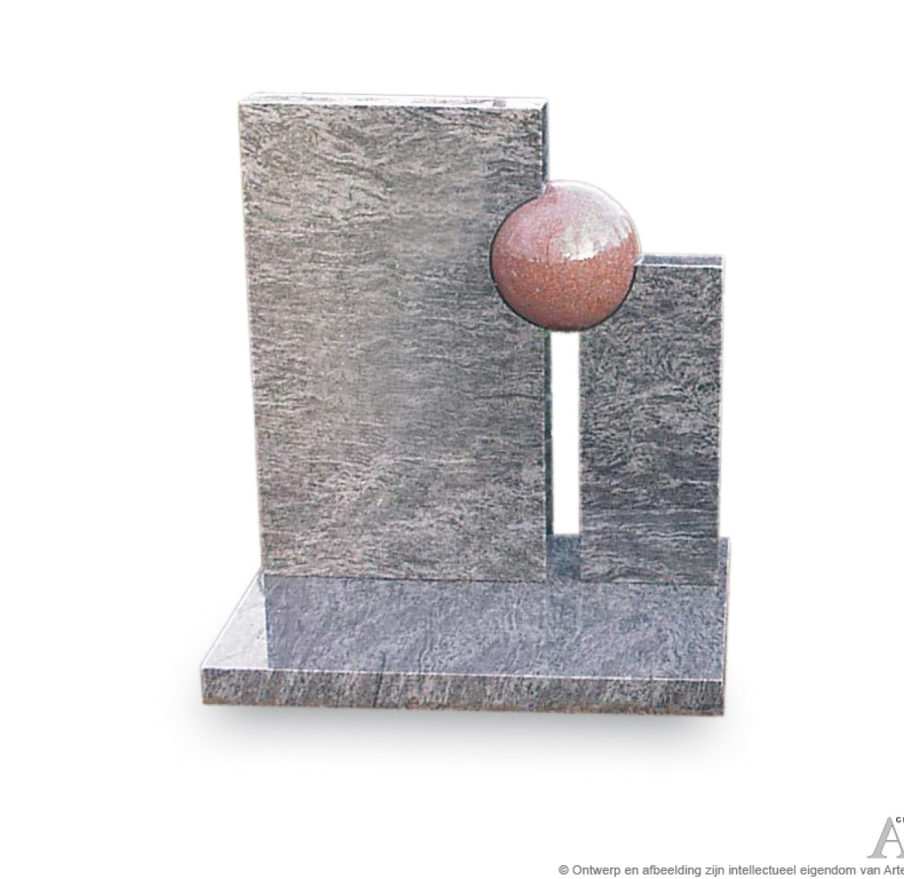 Fraai urnmonument met bal van graniet, hier uitgevoerd in Orion en Imperial Red. De geometrische vormen zijn gepolijst en perfect afgewerkt. Prijs vanaf EUR 990,00 inclusief plaatsing