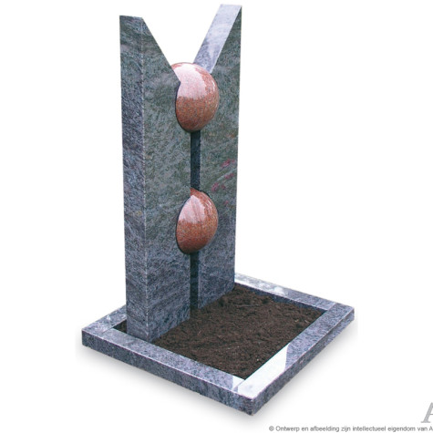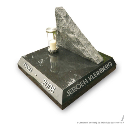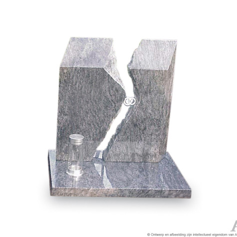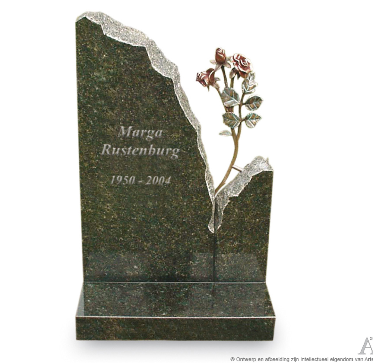 Urnmonument met bronzen rozen. Uit de gespleten aarde groeit de roos. Een zeer persoonlijk urnmonument hier uitgevoerd in een donkere granietsoort waarvan het grootste gedeelte gepolijst is. De zijkanten van het staande deel zijn gekapt. Heeft u dit model liever geheel gepolijst? Vraag de medewerkers van Artea om advies. Zij helpen u graag. Prijs vanaf EUR 750,00 inclusief plaatsing, exclusief accessoires.