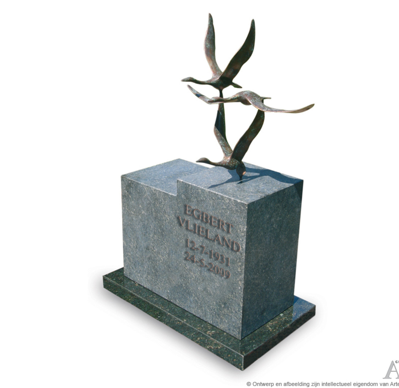 Schitterend urnmonument met asruimte in "dubbele" sokkel. Hier afgebeeld met stylistische bronzen vogels. Prijs vanaf EUR 995,00 inclusief plaatsing (exclusief bronzen vogels)