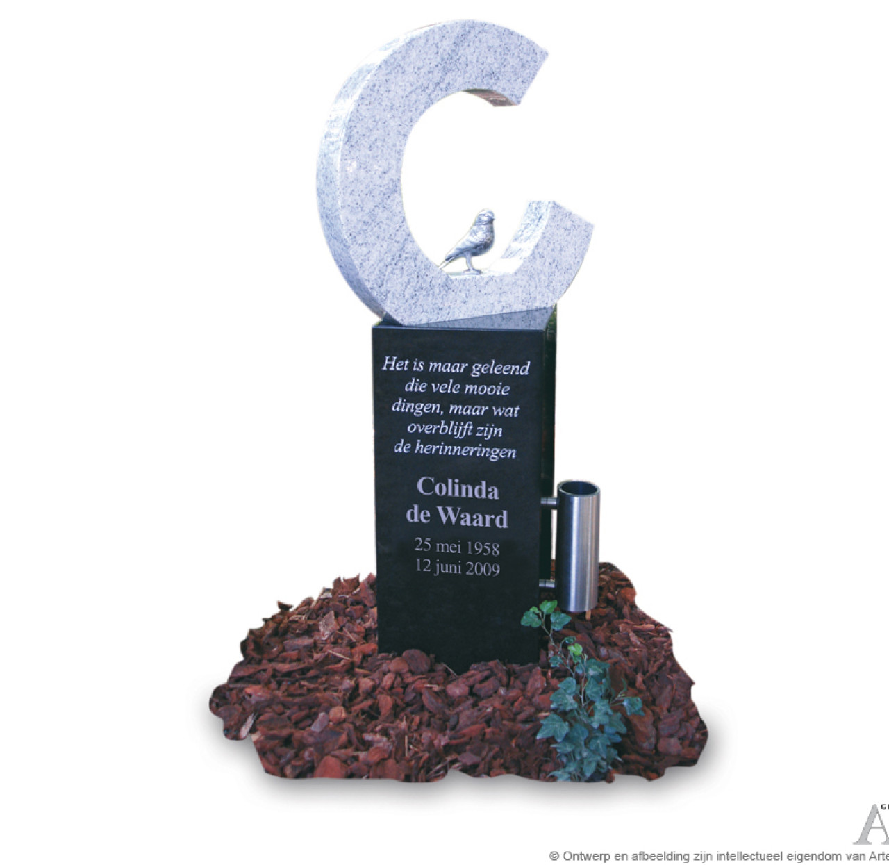 Een urnmonument zuil met een persoonlijk detail, namelijk de granieten letter. De voorletter van de dierbare overledene. Hier een C op een passende zuil. Het vogeltje is een mooi accent. Prijs vanaf EUR 1.575,00 inclusief plaatsing, maar exclusief accessoires.