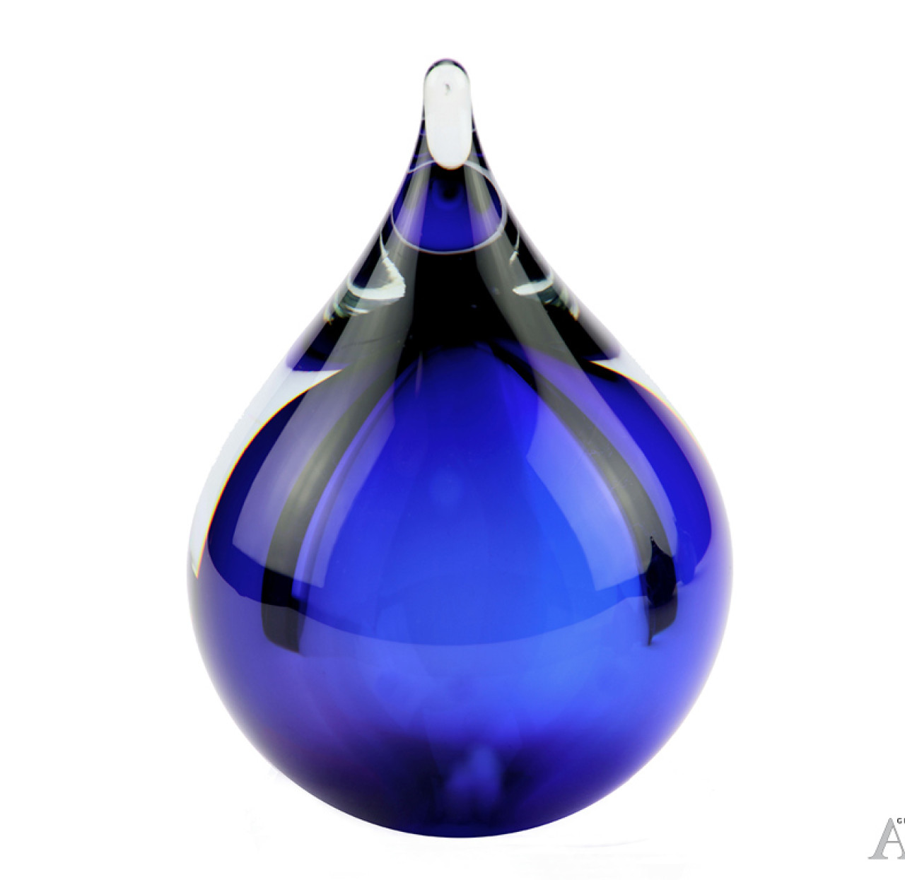 Urn/Sierurn As-Bubble Blauw heeft een ronde druppel vorm. De geoliede kleuren lopen vloeiend in elkaar over. In de kern bevindt zich een as-reservoir waar een gedeelte van het crematie-as in bewaard kan worden. Door de transparantie van het glas is het crematie-as deels zichtbaar. D.m.v. een zelf-hechtende sluitplaat wordt het as-reservoir afgesloten. Dit gedenkornament is in één maat uitgevoerd: 14 cm/120 ml. De Bubble is een waar kunstwerkje ter herinnering aan uw dierbare. Alle as-gedenkornamenten zijn van kristalglas en met de hand vervaardigd. Dit maakt elk ornament uniek. Prijs EUR 101,00