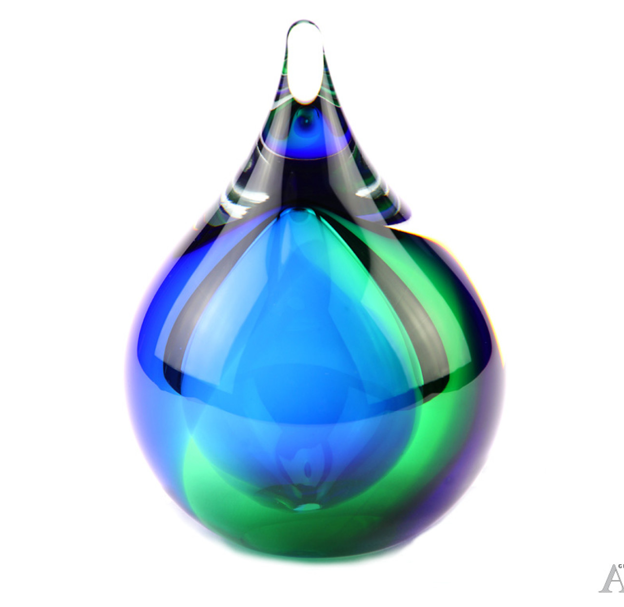 Urn/Sierurn As-Bubble Groen/Blauw heeft een ronde druppel vorm. De geoliede kleuren lopen vloeiend in elkaar over. In de kern bevindt zich een as-reservoir waar een gedeelte van het crematie-as in bewaard kan worden. Door de transparantie van het glas is het crematie-as deels zichtbaar. D.m.v. een zelf-hechtende sluitplaat wordt het as-reservoir afgesloten. De Bubble is een waar kunstwerkje ter herinnering aan uw dierbare. Dit gedenkornament is in één maat uitgevoerd: 14 cm/120 ml. Alle as-gedenkornamenten zijn van kristalglas en met de hand vervaardigd. Dit maakt elk ornament uniek. Prijs EUR 101,00