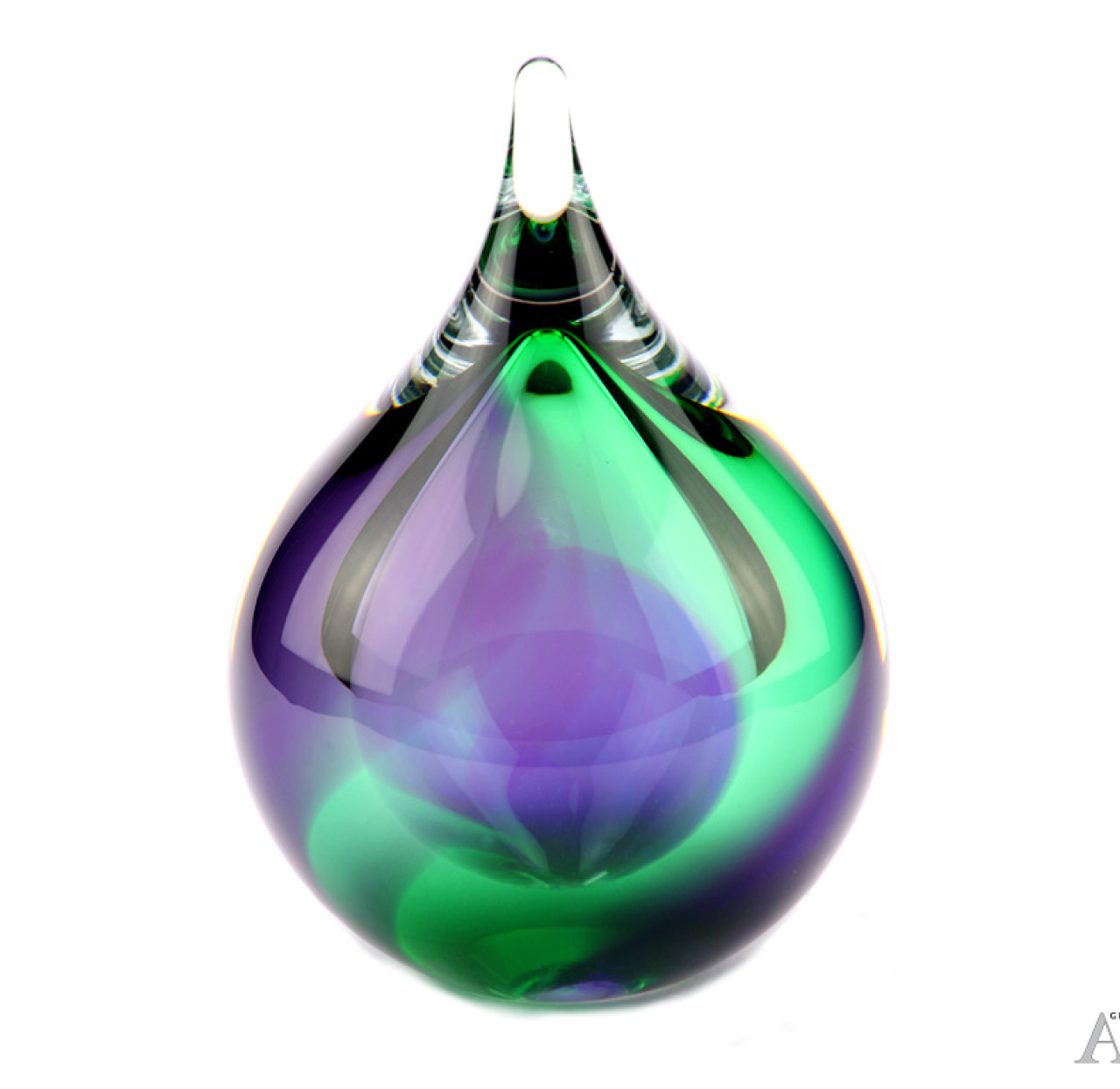 Urn/Sierurn As-Bubble Groen/paars heeft een ronde druppel vorm. De geoliede kleuren lopen vloeiend in elkaar over. In de kern bevindt zich een as-reservoir waar een gedeelte van het crematie-as in bewaard kan worden. Door de transparantie van het glas is het crematie-as deels zichtbaar. D.m.v. een zelf-hechtende sluitplaat wordt het as-reservoir afgesloten. Dit gedenkornament is in één maat uitgevoerd: 14 cm/120 ml.De Bubble is een waar kunstwerkje ter herinnering aan uw dierbare. Alle as-gedenkornamenten zijn van kristalglas en met de hand vervaardigd. Dit maakt elk ornament uniek. Prijs EUR 110,00 (inclusief vullen)