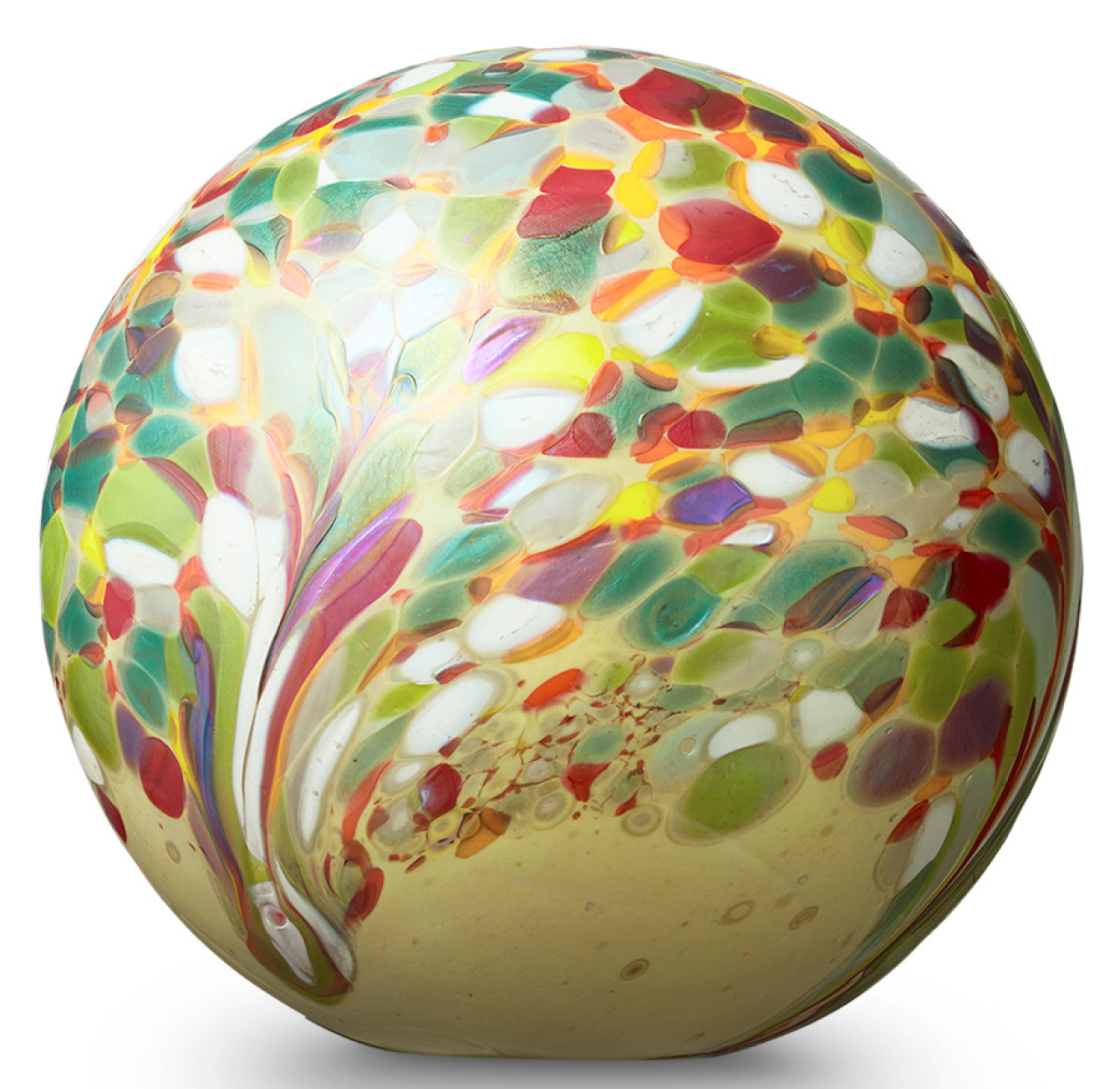 Deze bolvormige, glazen urn heeft diverse heldere bloemen kleuren met een gevlekt patroon. Aan de binnenzijde van de urn bevindt zich een as-reservoir waar al het crematie-as in bewaard kan worden. Deze urn wordt afgesloten d.m.v. een zelf-hechtende sluitplaat. De urn is niet transparant dus het crematie-as is niet zichtbaar. Deze urn is leverbaar in vier maten: 8 cm/100 ml.; 12 cm/0,5 ltr.; 17 cm/1,5 ltr.; 20 cm/4 ltr. Deze, met de hand vervaardigde urn, is een waar kunstwerk ter herinnering aan uw dierbare. Prijs EUR 139,00 / EUR 169,00 / EUR 189,00 / EUR 500,00 (inclusief vullen)