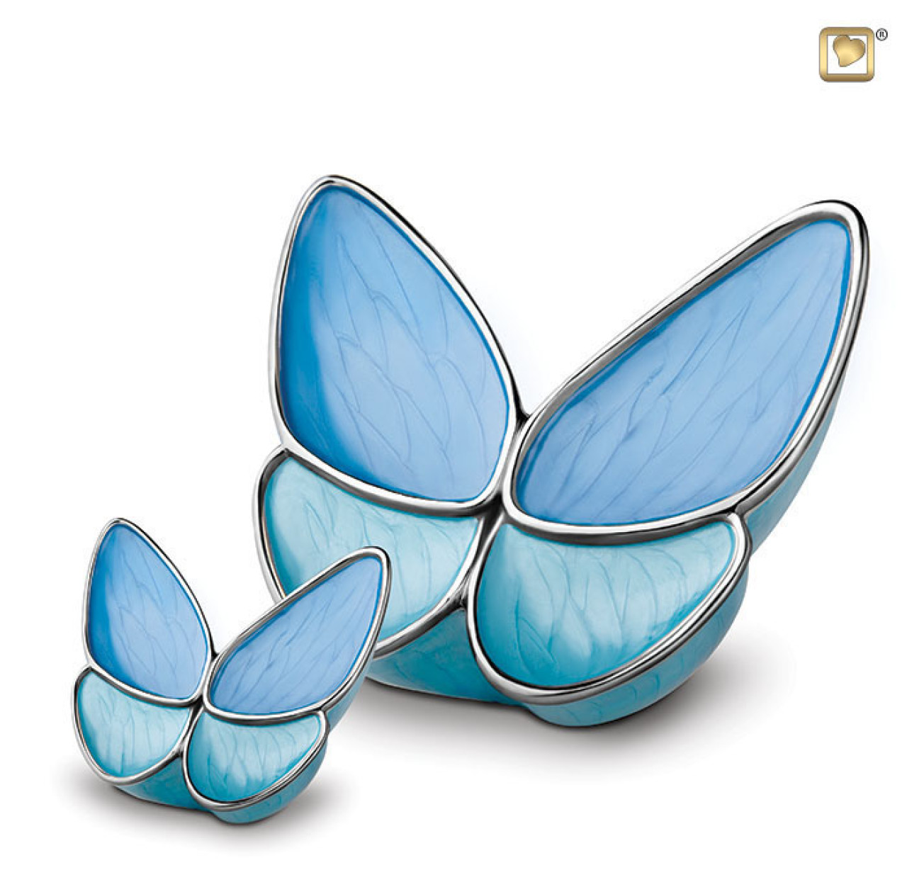 De sierurnen 'Butterfly' zijn er in 2 verschillende maten (2,7 liter / 0,05 liter), hier afgebeeld in een blauwe tint. Een prachtig symbool om uw geliefde in te gedenken. Bezoek ook onze showroom en bekijk onze uitgebreide collectie sierurnen. Prijs EUR 379,00/EUR 90,00