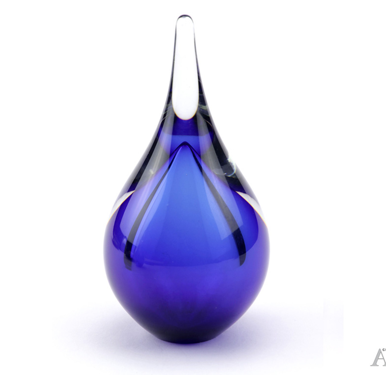 De kleine Glasdruppel in het donkerblauw heeft de vorm van een kleine sierlijke druppel. In de kern van de as-druppel bevindt zich een klein as-reservoir waar een gedeelte van het crematie-as in bewaard kan worden. Het as-reservoir wordt afgesloten d.m.v. een zelf-hechtend sluitplaatje. Door de transparantie van het kristalglas is het crematie-as deels zichtbaar. In combinatie met de warme kleurschakeringen krijgt het as-gedenkornament een extra dimensie en een prachtige uitstraling. Deze kleine glasdruppel is verkrijgbaar in 6 unie-kleuren en in een aantal verschillende kleurschakeringen. Ze zijn gemaakt van kristalglas en met de hand vervaardigd. Dit maakt elk ornament uniek. De glasdruppel is leverbaar in één maat: 14 cm hoog/inhoud 50 ml. De glasdruppel is een lieflijk aandenken ter herinnering aan uw dierbare. Bezoek ook onze showroom en bekijk onze uitgebreide collectie sierurnen. Prijs EUR 78,00